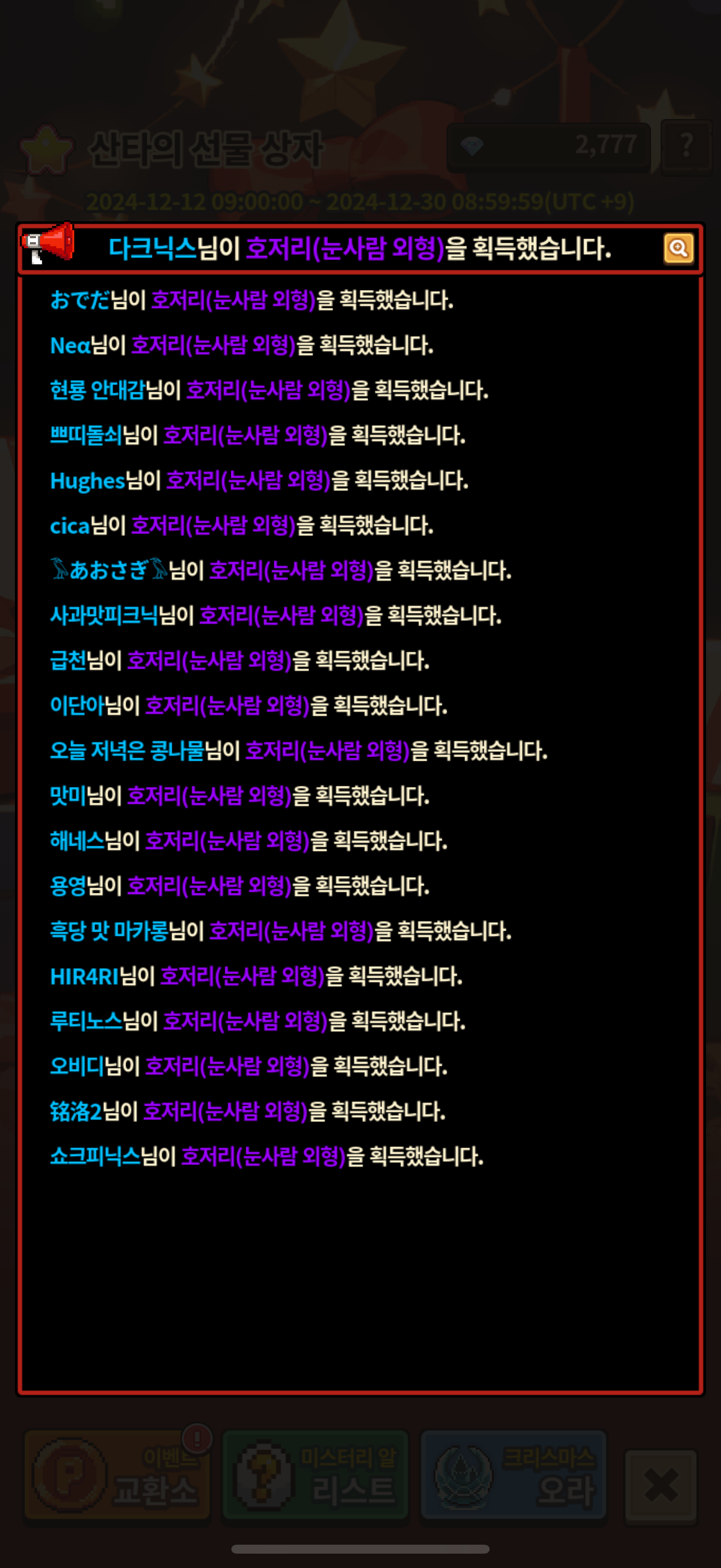 별트리 외형 크리마용은 천장이랑 다이아로 구했지만 이번 눈사람 외형 호저리는 별트리 외형 크리마용이랑은 다르게 천장 42회 남기고 나와줬어요 ㅠㅋㅋㅋ