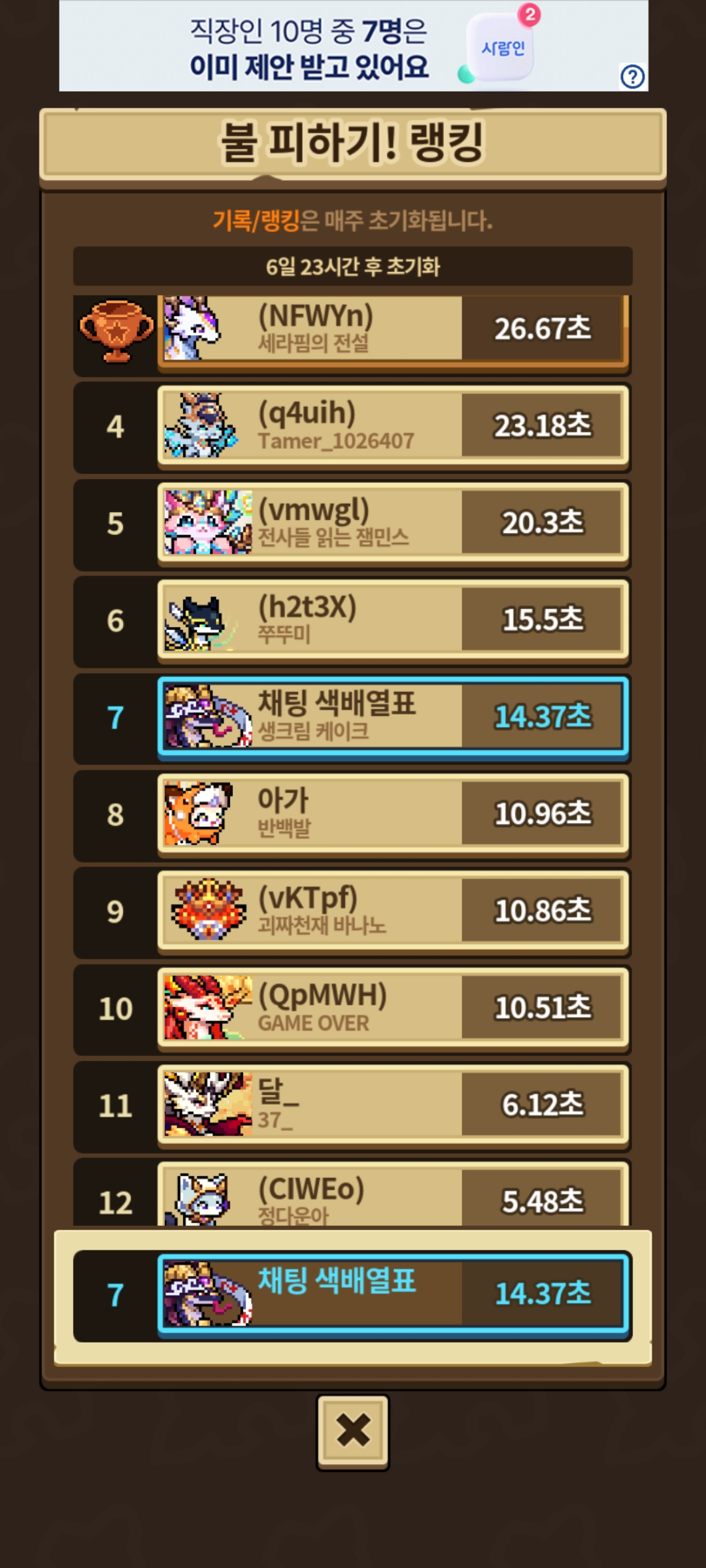오 상자가 중앙정도에 3개 있네요 이런경우는 저도 처음봅니다...! (그리고 불피하기 미니게임 7위 해보는건 처음이네요ㅋㅋ)