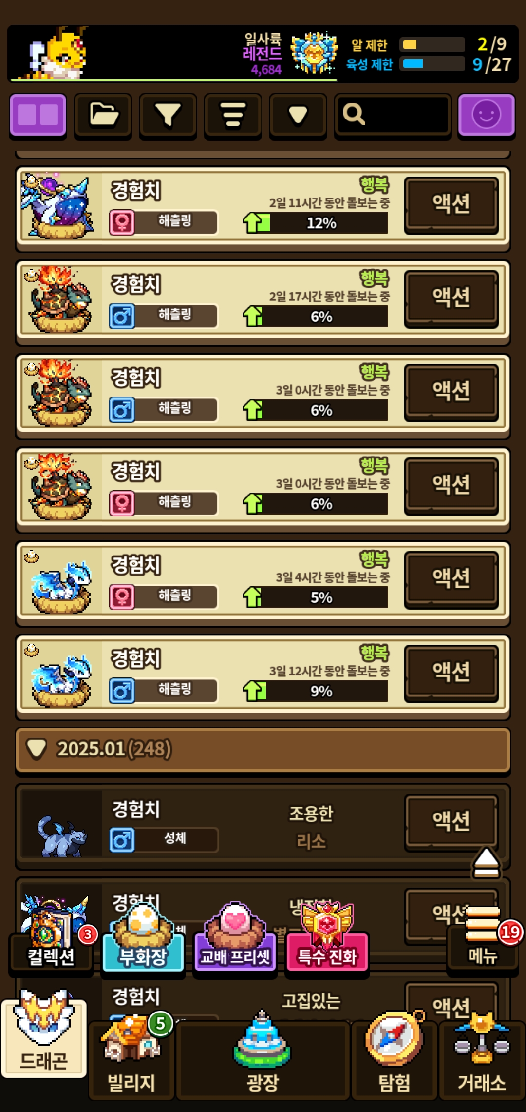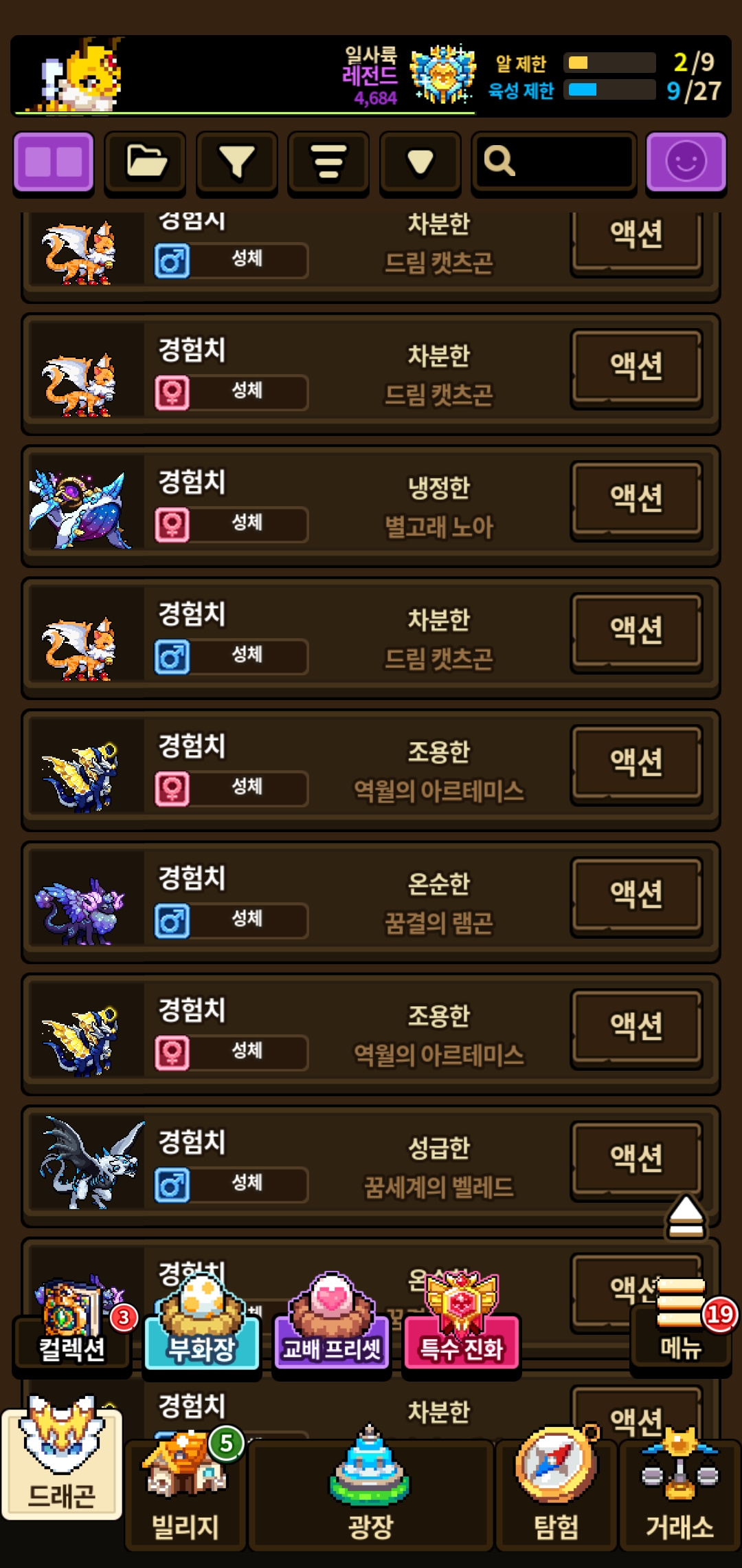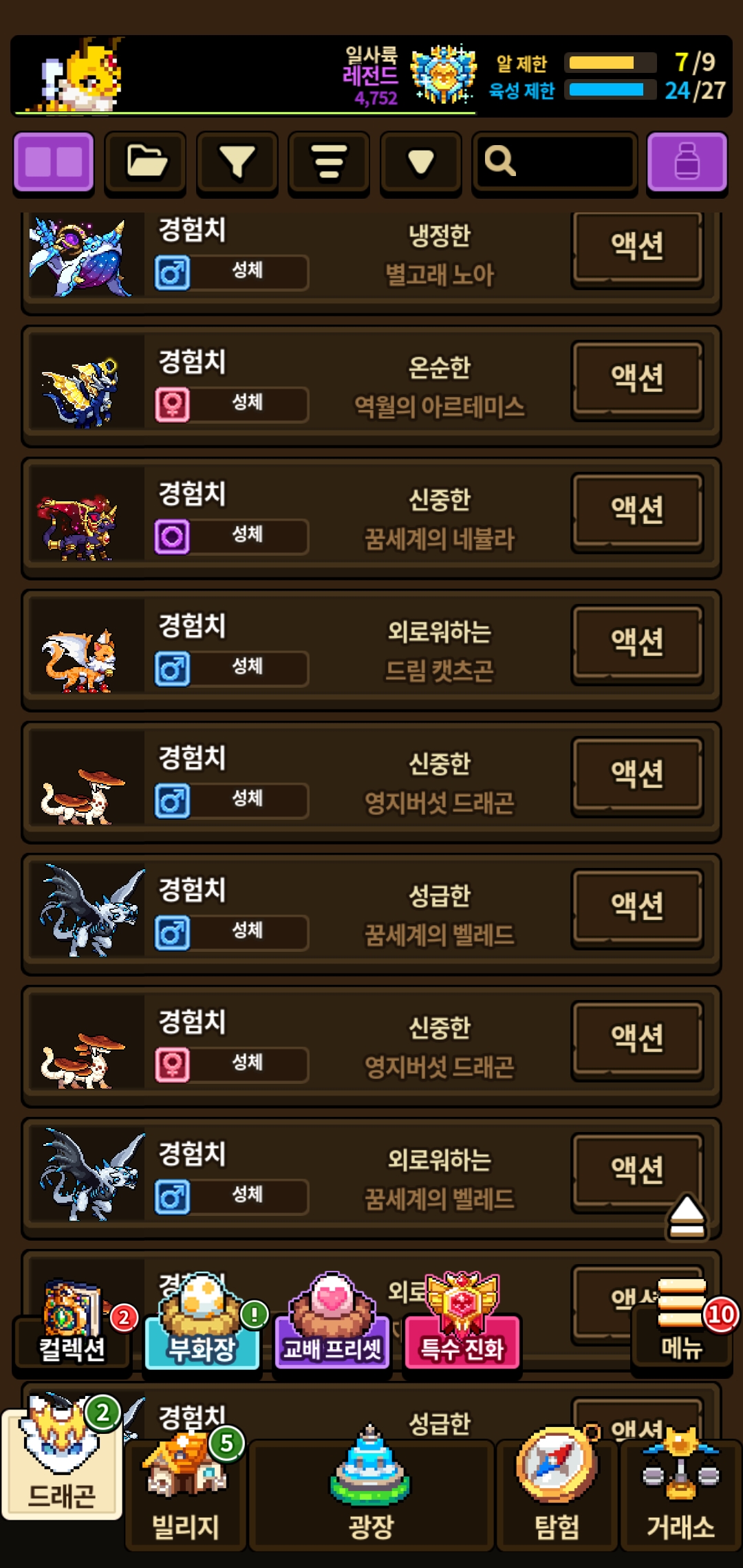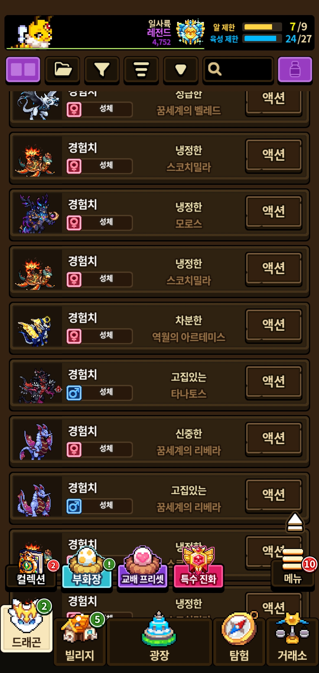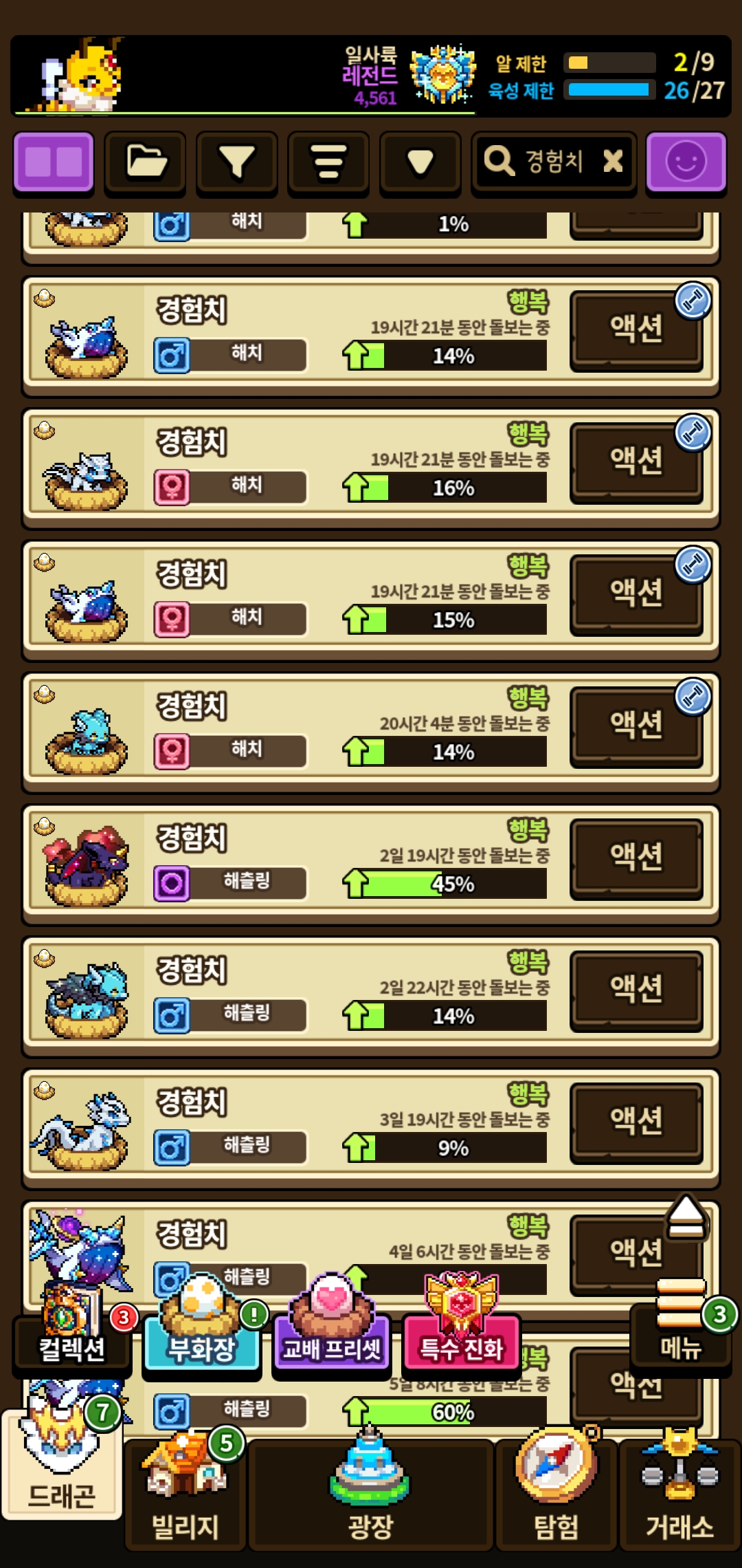 원래 드래곤들 전부 종족명으로 이름 지어주고 성별, 획득 순서 따라서 넘버링 해줬는데 하늘왕국부터 지겨워져서 넘버링 빠지더니 이번 꿈세계에서는 그냥 다 경험치로 통일했어요