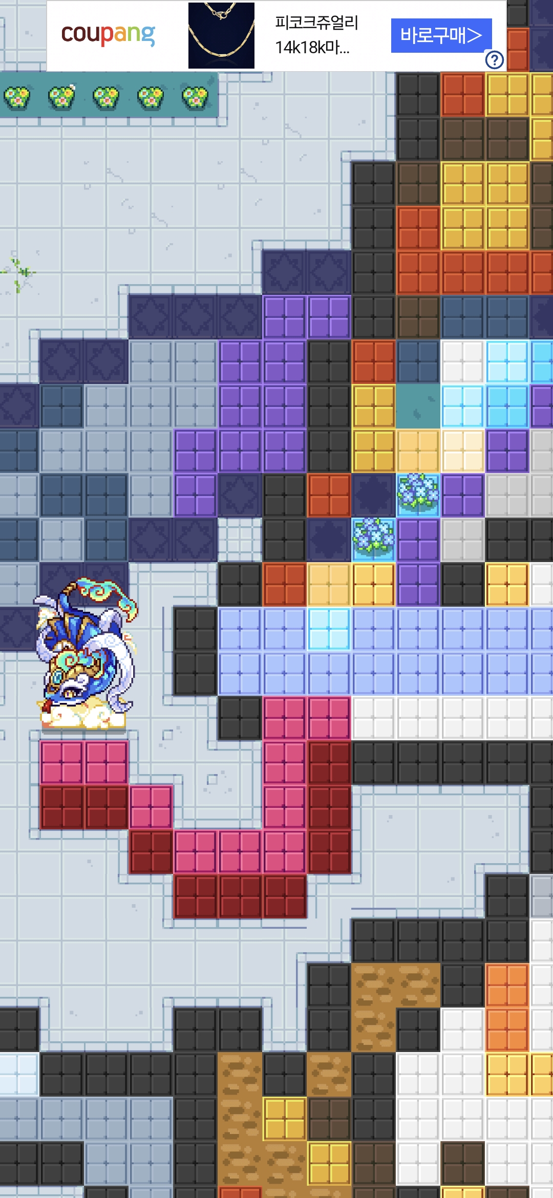 이젠 수정 다한거 같네요 길드장분 께서 청룡 동상 없는게 좋다는 조언을 듣고 청룡 동상 철거후 보기가 더 좋아진거 같습니다 도트가 틀린그림 다 확인한거 같네요 무지개 팔레트 더 추가 되면 좋겠네요 색이 별로 없네요