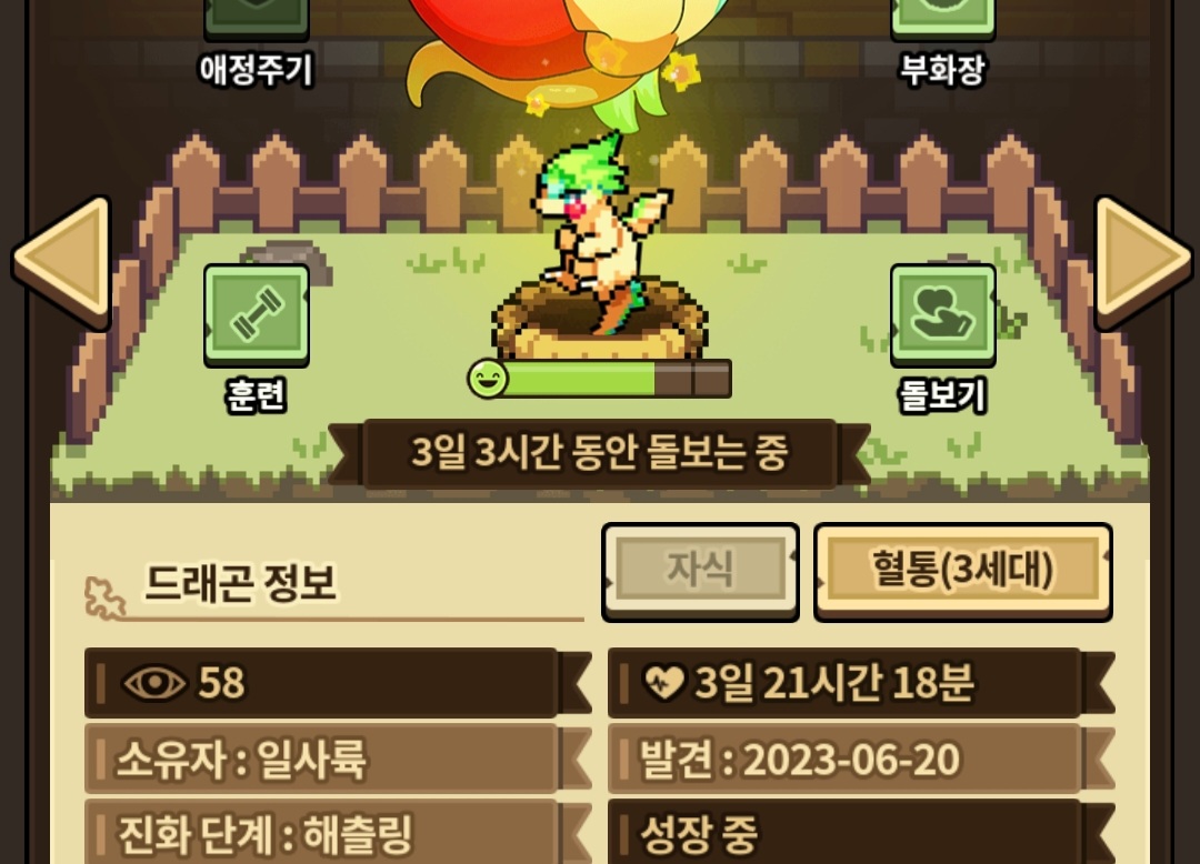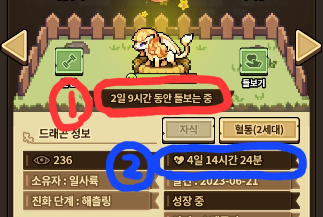 - ②: 드래곤에게 남은 시간입니다. 이 기간 내에 진화하지 못하면 죽습니다. 시간이 지날수록 점점 표시되는 숫자가 줄어들며, 드래곤이 다음 단계로 진화하면 다시 5일의 시간이 주어집니다.
