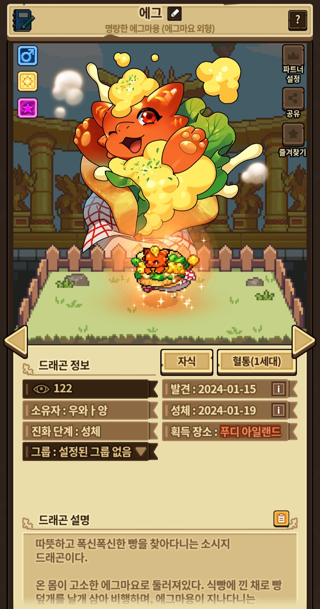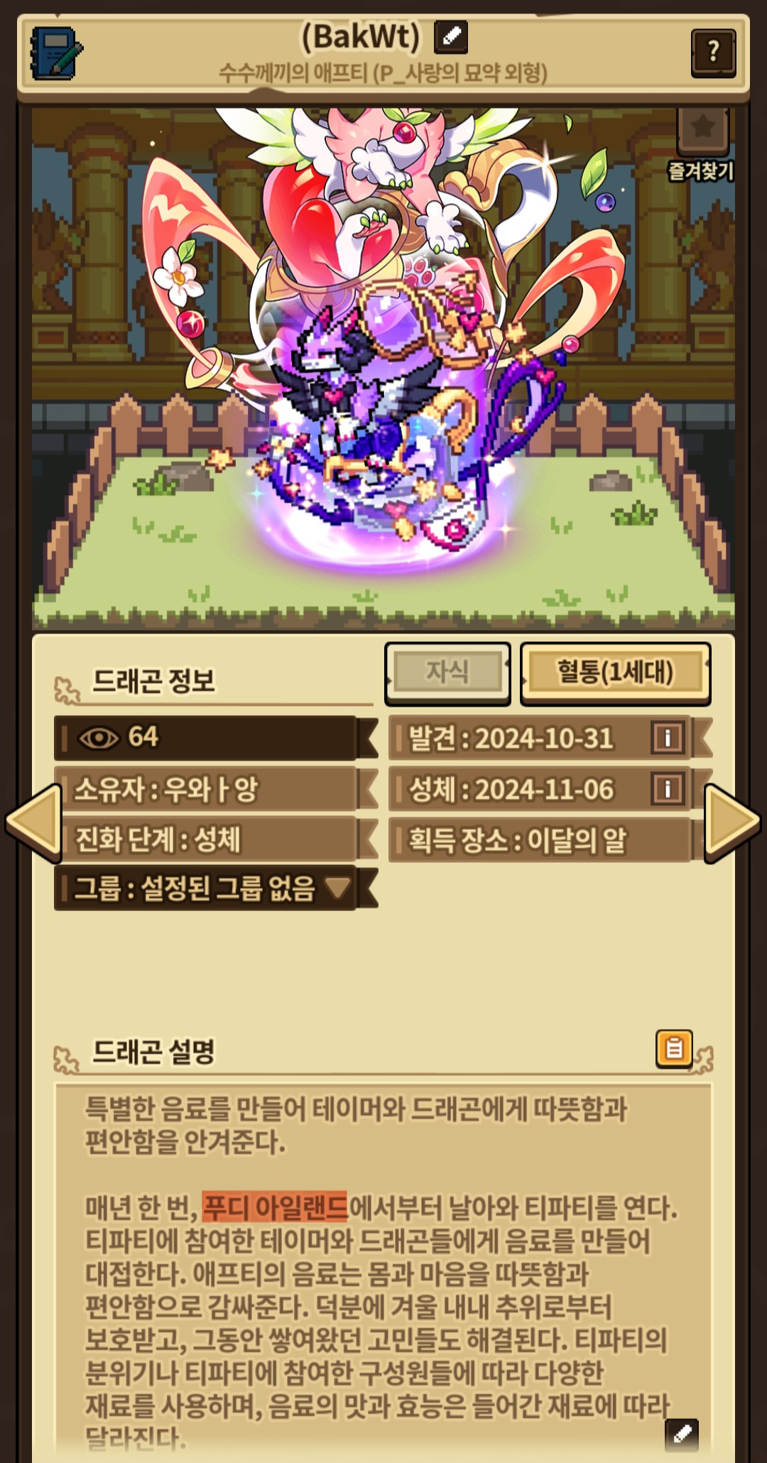 이번에 애프티를 깨비 장터에서 사서 한 번 봤는데 둘이 같은 출신지인 걸 알았어요! 제가 빵이나 마카롱, 떡이 모티브인 다른 드래곤들을 찾아봤는데 푸디 아일랜드를 언급한 드래곤이 없었거든요. 우와, 완전 신기해요!!