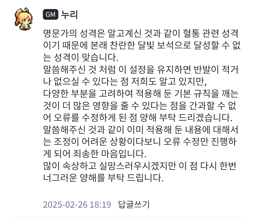 적어도 운영측의 명백한 과실로 이런 상황을 만들었으면 적극적으로 해결하거나 대처해주려 들어도 모자란데 이지선다 중 아무것도 안 한다는걸 선택하실거라고는 생각조차 못했네요. 이게 정말 소통하는 운영이 맞습니까??