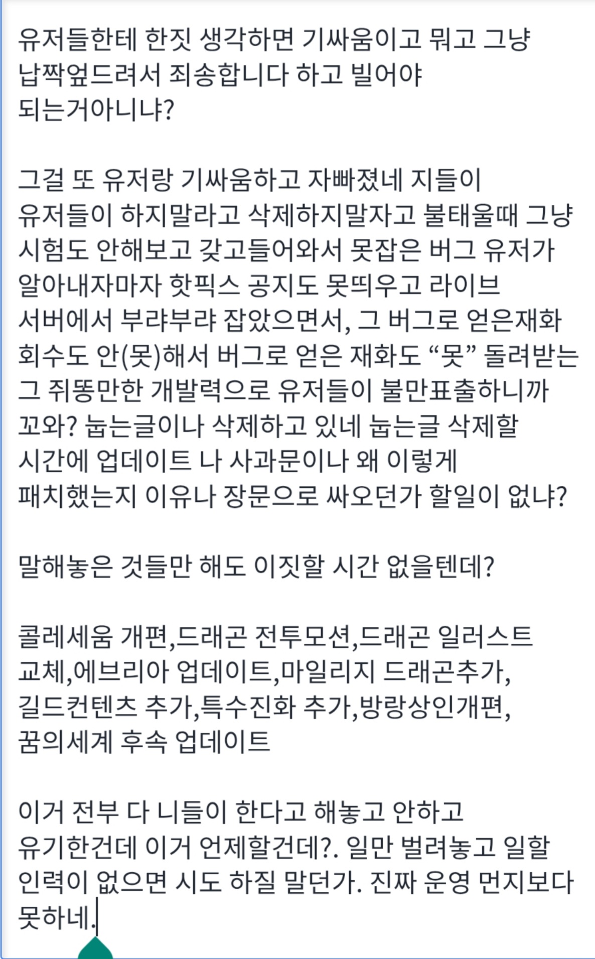 있던 컨텐츠 5개 분쇄해서 업뎃도 계속 미루는 니들이 도대체 뭘 할 수 있는데?