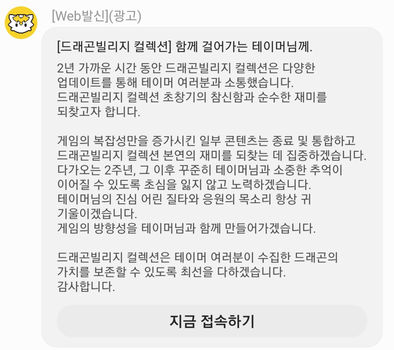 유저 기만좀 그만해라.. 죄송하면 공식 커뮤니티에 글을 쓰던가 괜히 보낸 메세지에 광고붙여서 차단메시지 사이에서 발견했는데 이게 하브가 유저에게 보내는 통보장인지 사과문인지 유저들이 대다수가 빠져나가니까 돈은 못벌까 불안하긴하고 그렇다고 또 사과문은 “못”,"안"쓰고 싶고 유저에게 사과나 믿음을 주는법을 애즈녁에 갖다 버려서 할줄은 모르겠으니까 그냥 뇌절해버리네 공식 커뮤니티 알람 공지사항 개발자 노트 이런건 개나줬나..? 이딴식으로 운영하고 귀닫고 눈닫고 아몰랑 시전하면 유저가 안떠나간다냐?