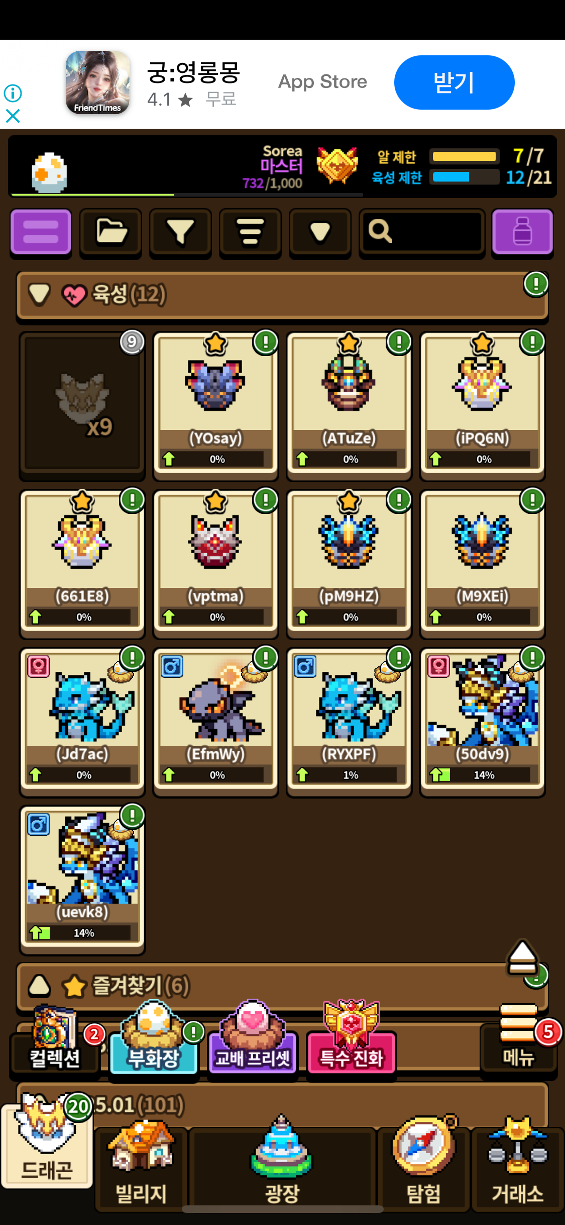 네 접어서 그림대회 마감일까지는 안가려고 했는데 생각해보니 저번에 마스터 기념 나눔도 말하고 안했었고, 기분전환겸 모든 카코용 교배 돌렸더니 이정도 나왔네요 즐찾된게 모두 특외입니다 룰렛으로 할 예정이에요 :)