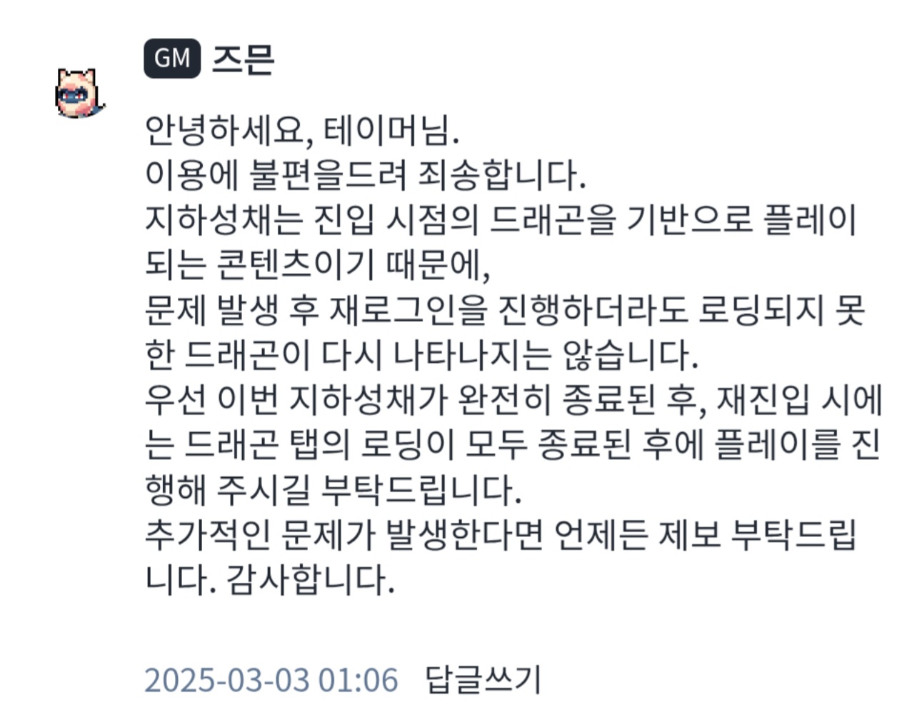 지들이 인게임내에서 제대로 된 최적화를 못하고 컨텐츠 진입 당시에 드래곤 칸을 로딩하고 있던 중이였다며 드래곤 칸 로딩중에 들어간 유저를 탓함.