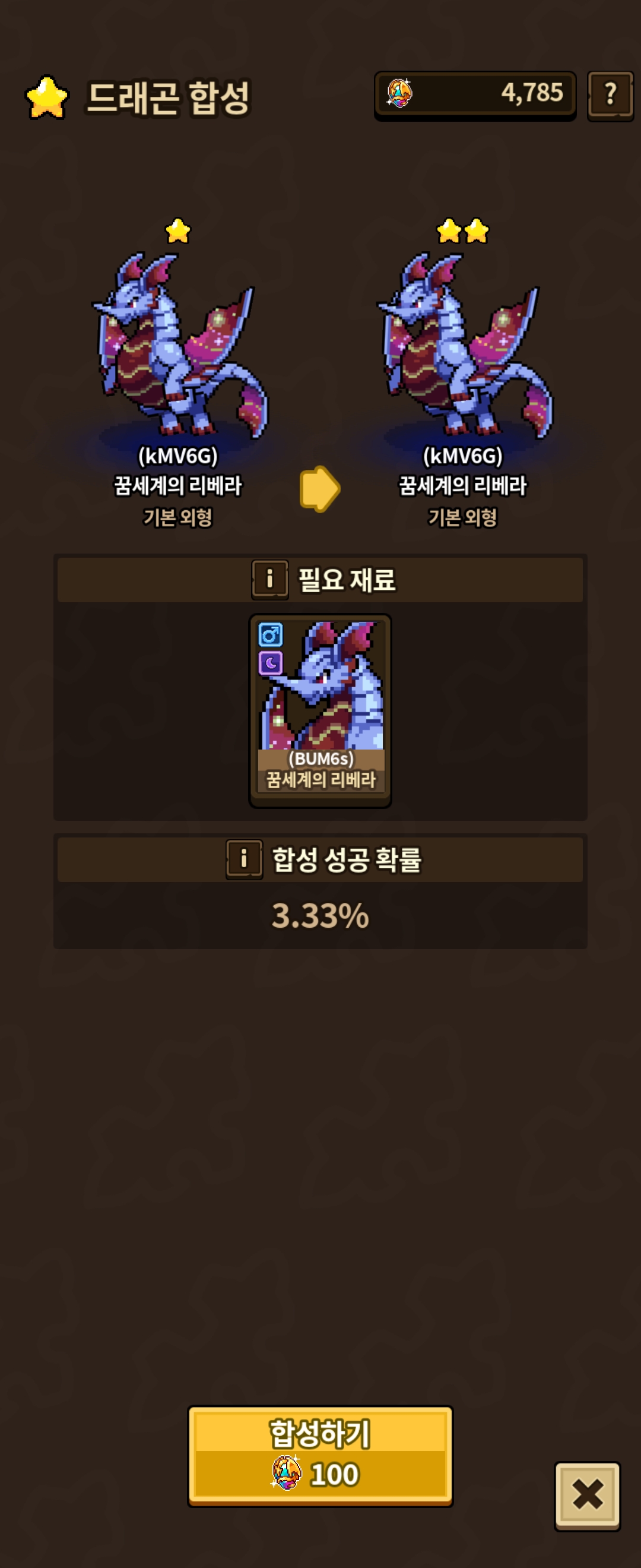 1→2 : 재료필수, 3.33% 확률