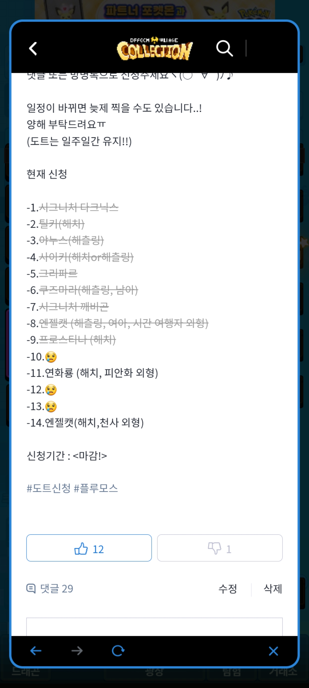 그런데 10, 12, 13번 신청글은 ‘😢’로 되어있는데, 왜 이모티콘을 올려놨나면, 신청하신 유저분들이