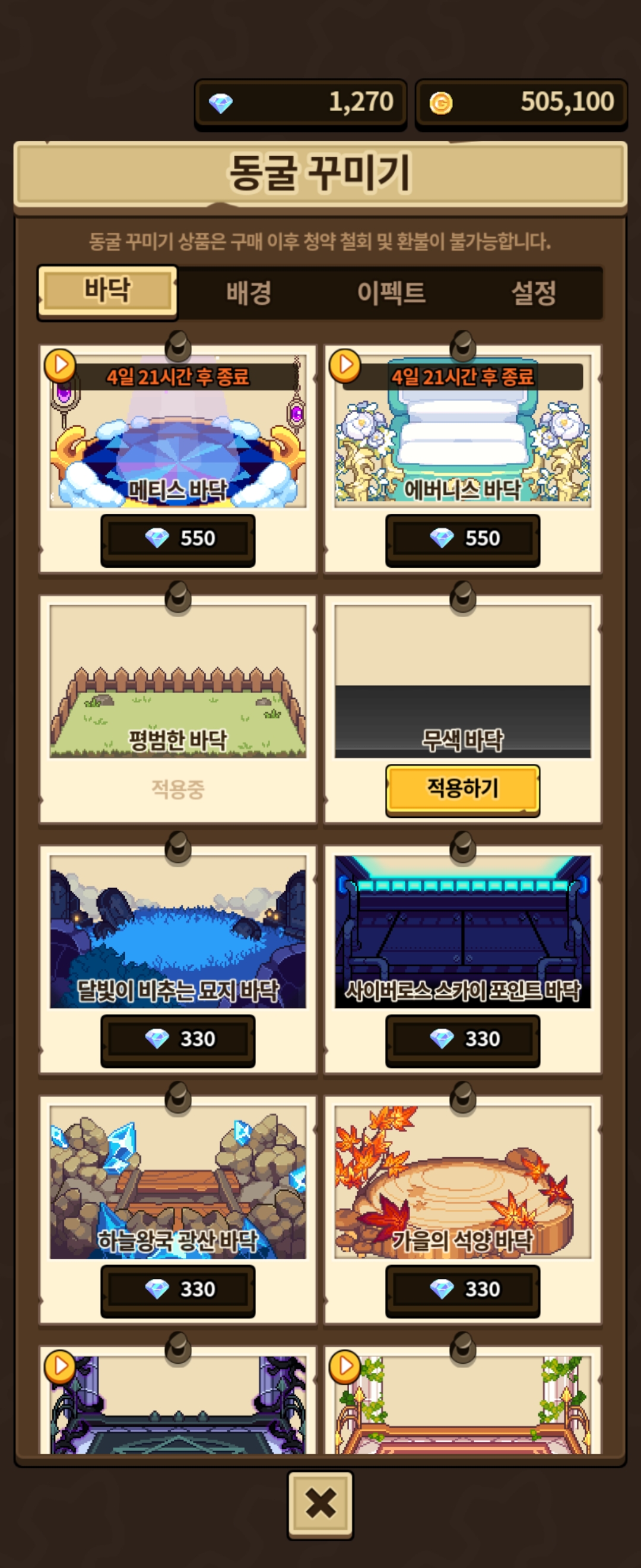 동굴꾸미기 항목으로 들어가면 구매 가능한 항목들이 나열되는데
