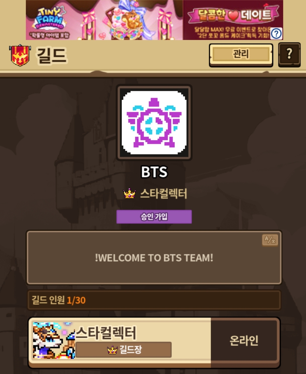 방탄좋아하시는 분들중에 길드에 가입하지않으신분들!!지금바로 길드'BTS'로 오세요!!사실 길드장은 저하나뿐이긴하나..함께하면 잘해내갈수 있다고믿습니다!행복한 길드를 꾸려나가도록 제가 열심히 해보겠습니다!!자격조건이나 “헉!!저 뉴비인데 괜찮나요??”