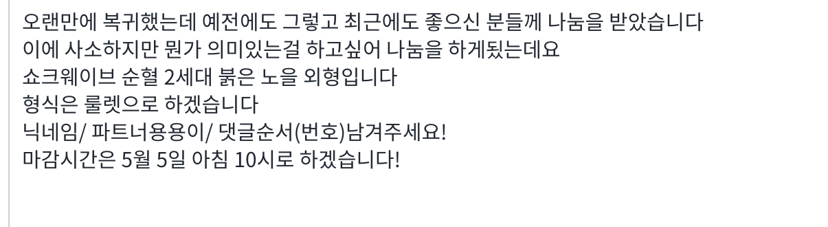 자유게시판 나눔합니당 화이트바니 2025-05-04 06:29 220 13 공유 공유 URL 복사 페이스북 왓츠앱 카카오톡 라인 레딧 닫기 공유 해치 상태입니다! 2 0 댓글 13 삭제 이미지첨부 0/3000 등록