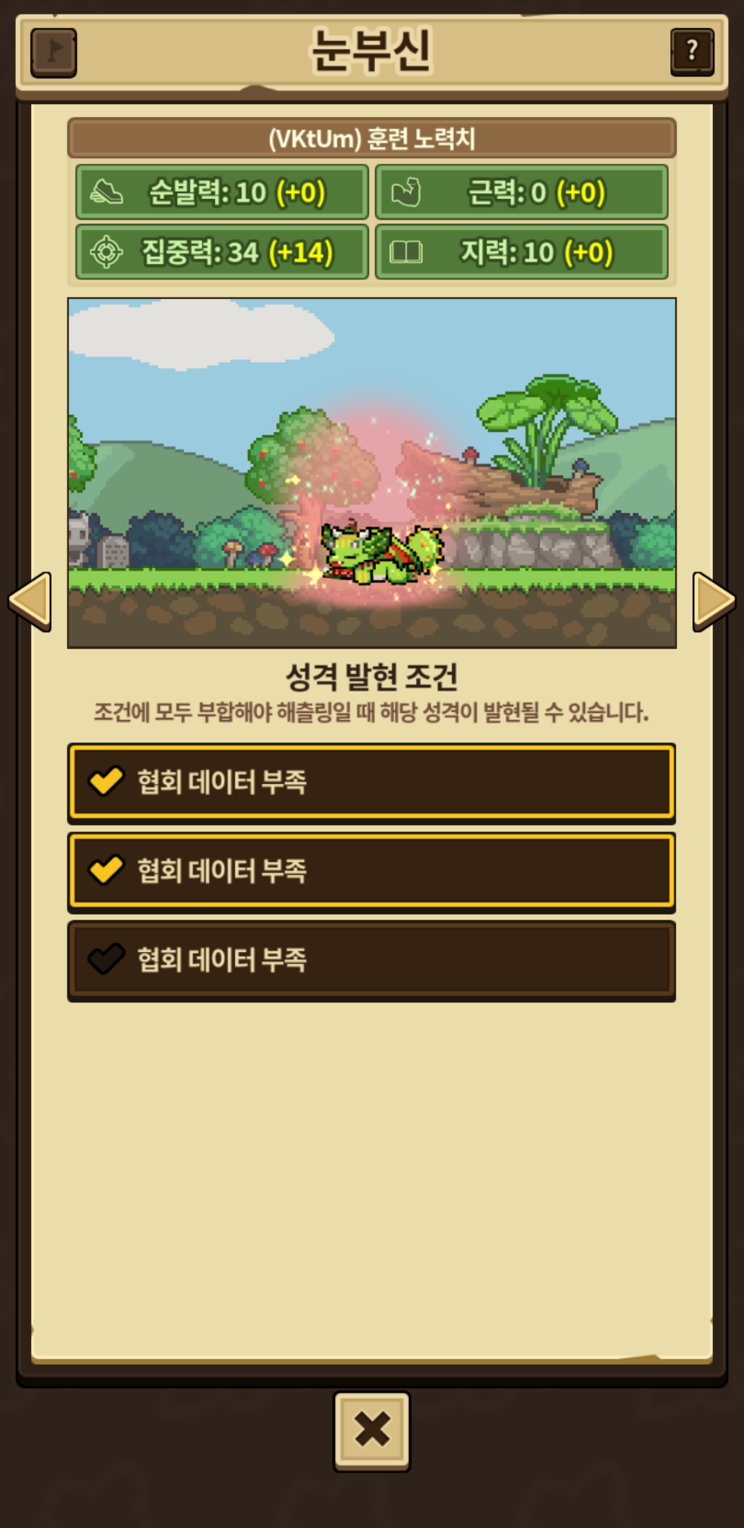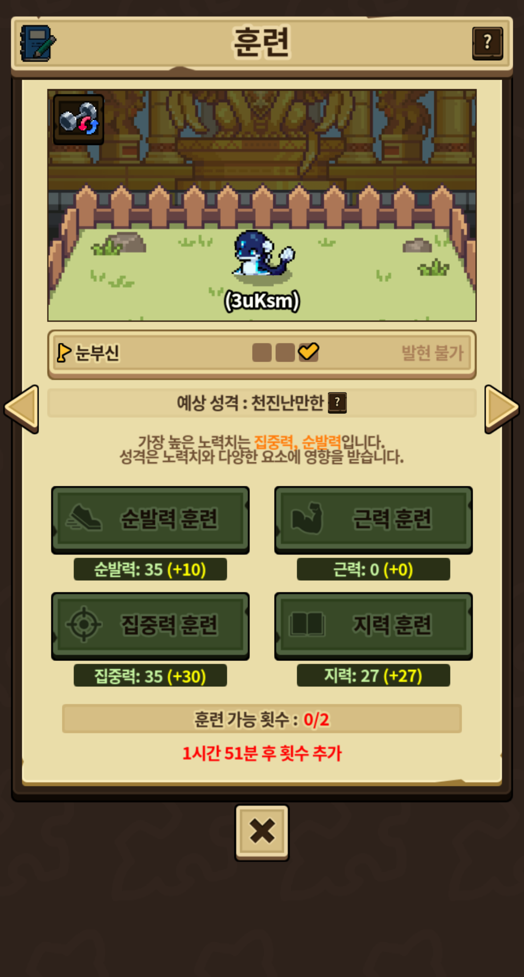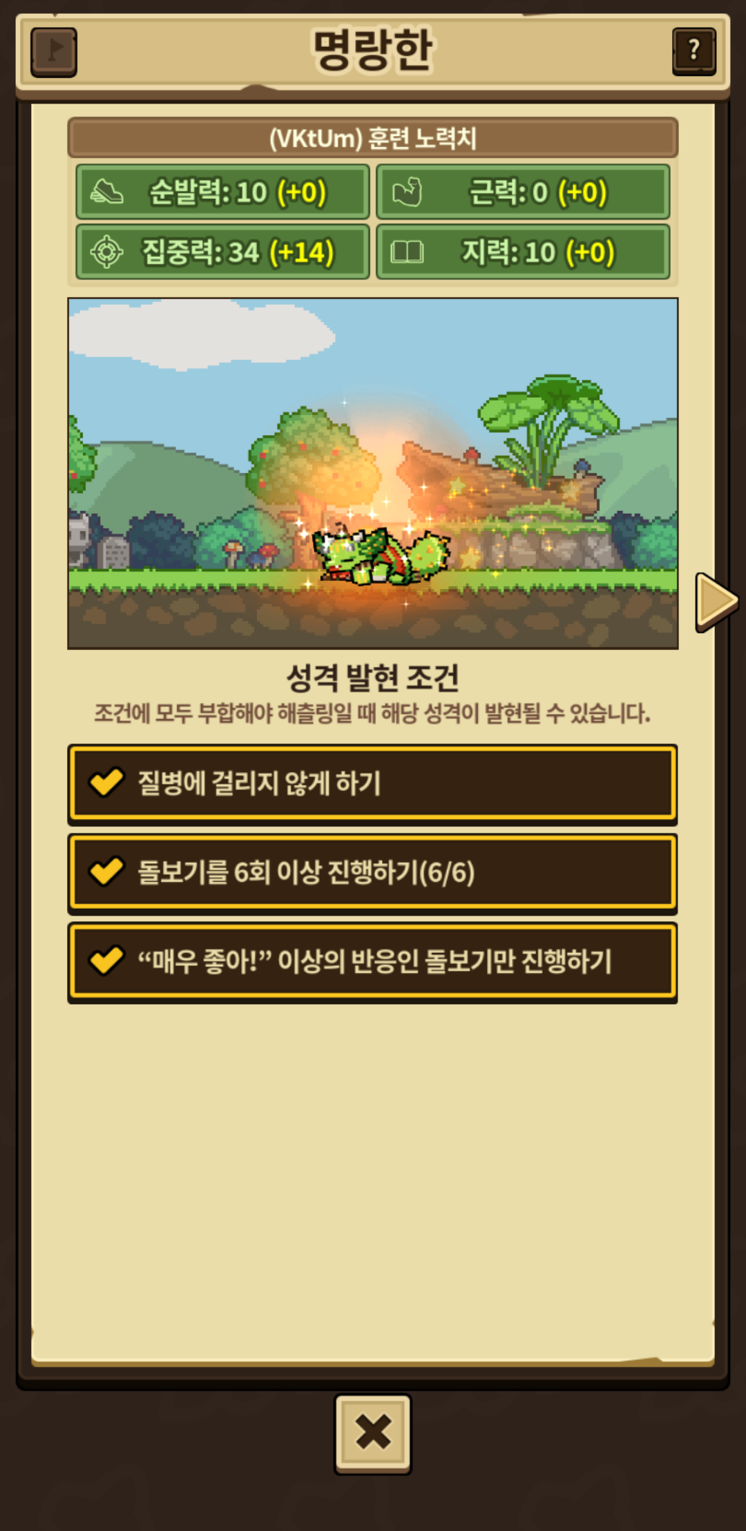 집중력 훈련을 5×6번을 하였기에 3번 조건은 최소 집중력 훈련 5회 이상이고 다른 노력치의 변동 여부와는 상관없는듯 합니다.