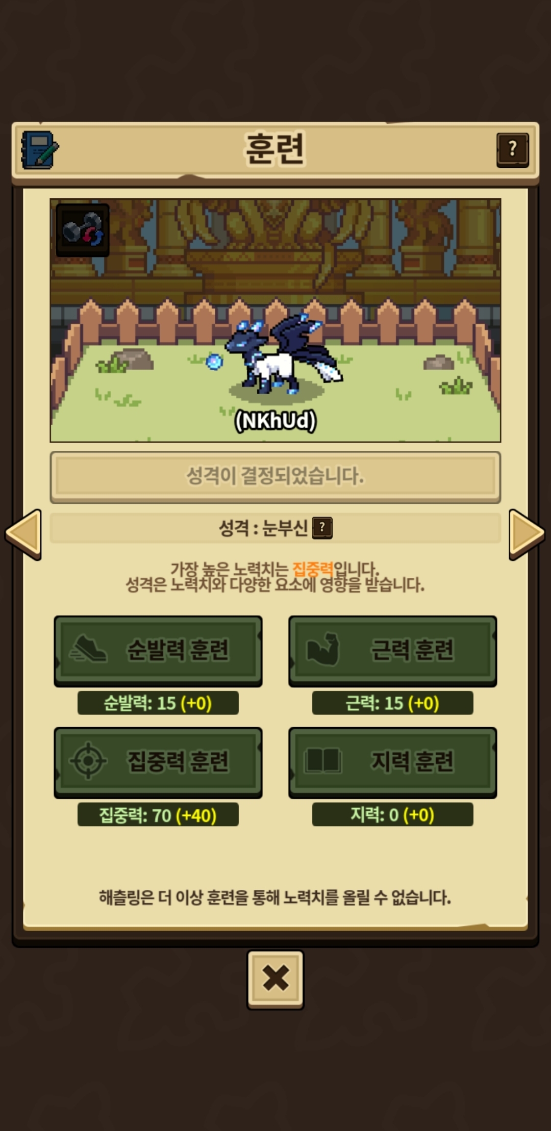 훈련은 집중력만 999553 해주었고, 능력치 총합 100입니다.