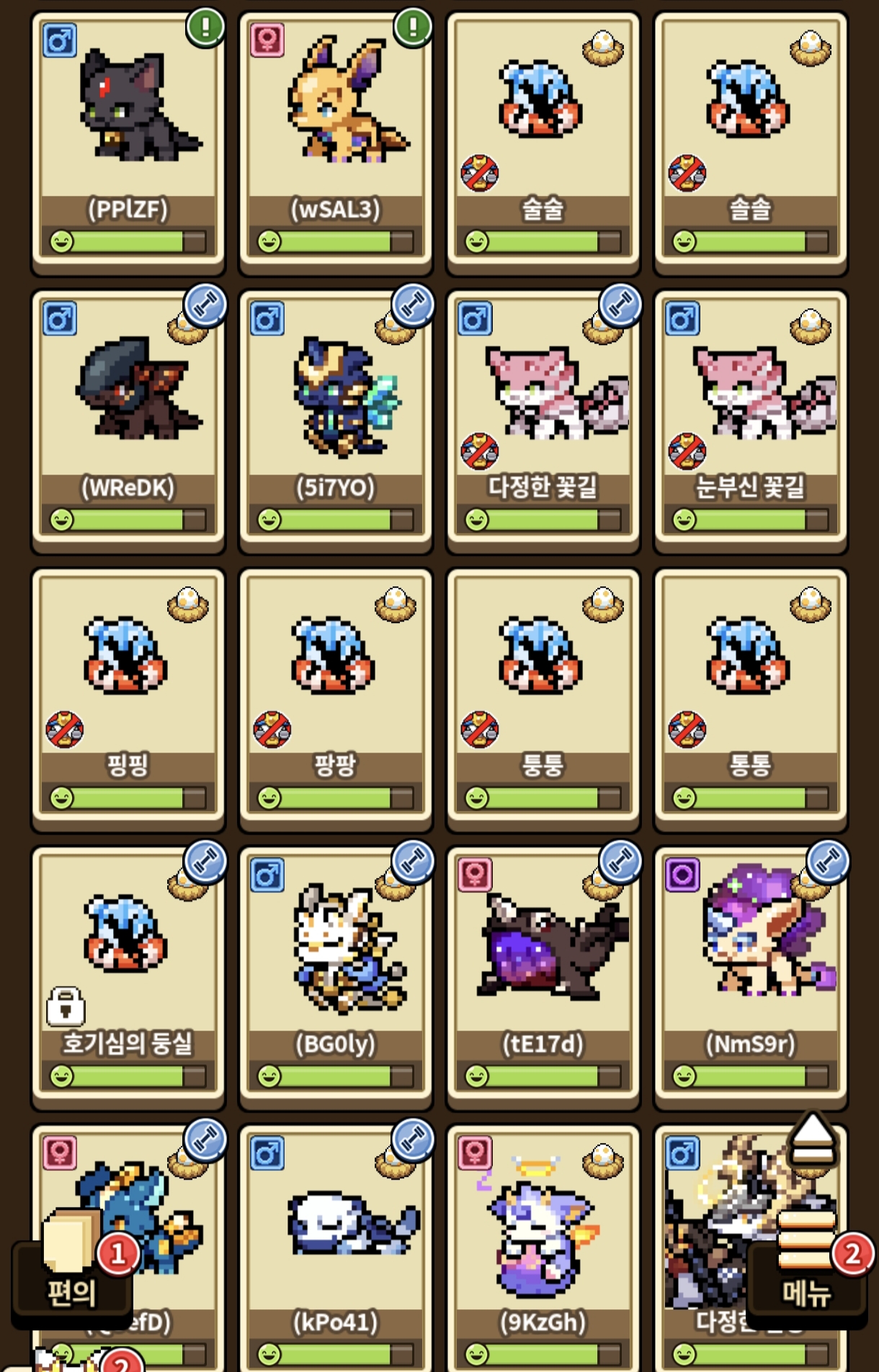 이번 깨장의 최대 목표였던 1세대 심판 클리드 1쌍을 이번에 겨우겨우 공수하게 되었는데, 2세대 심판 여아가 나오면 아껴둔 공허의 달조각을 발라줄 계획입니다📝 제 첫 아이는 아쉽게도 일반이지만 언젠간 나와주길 바라며...