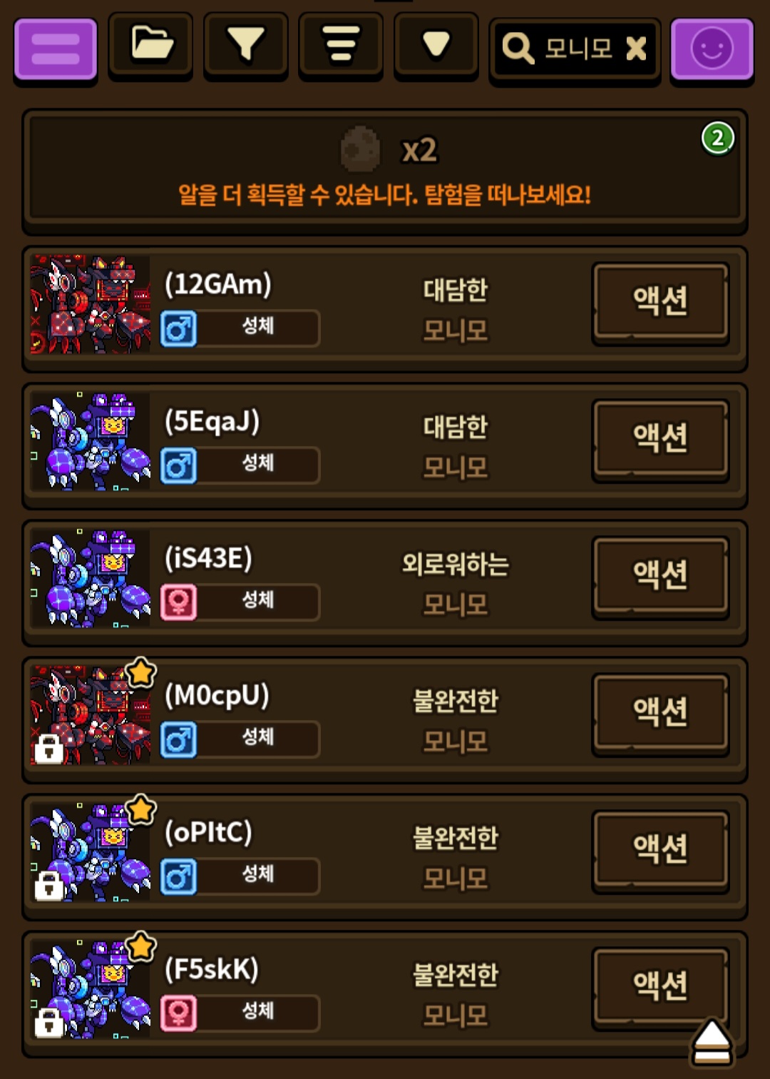 복귀한 김에 모니모도 몇 마리 쟁여두고 싶어서 현질 좀 하고 두 쌍 뽑고 교배 돌렸는데…….