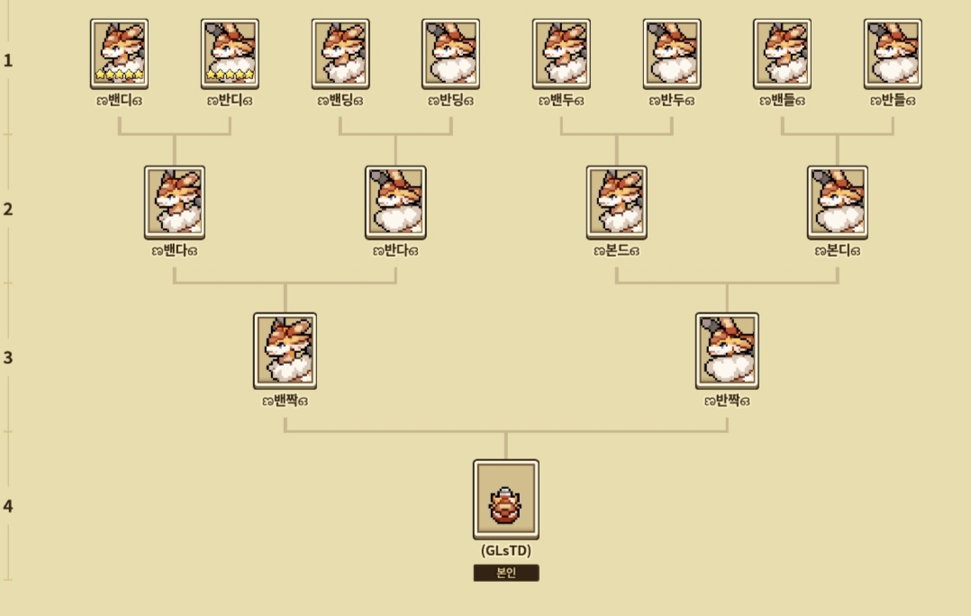 만들었습니다. 자작룡 보상이 추가로 지급된다는 이야기를 듣자마자 바로 구상한 족보작... 다만 만드는 데 성별 변환권을 2개 소모했고, 첫 한쌍을 너무 일찍 받은 탓에 3세대 명문가는 반쪽짜리가 되어버렸네요🫠