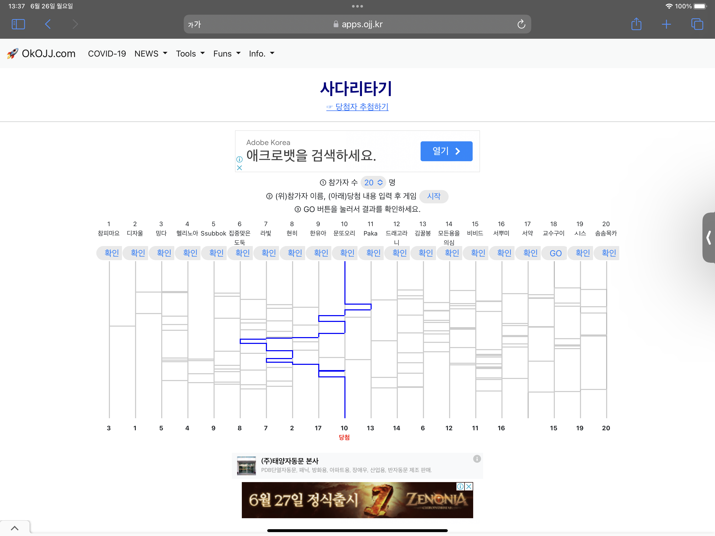 저 사다리도 최대가 스무명이라서 선착순으로 추첨 진행하게 됐습니다