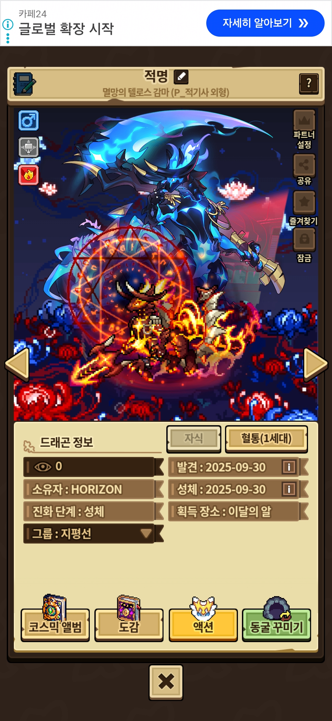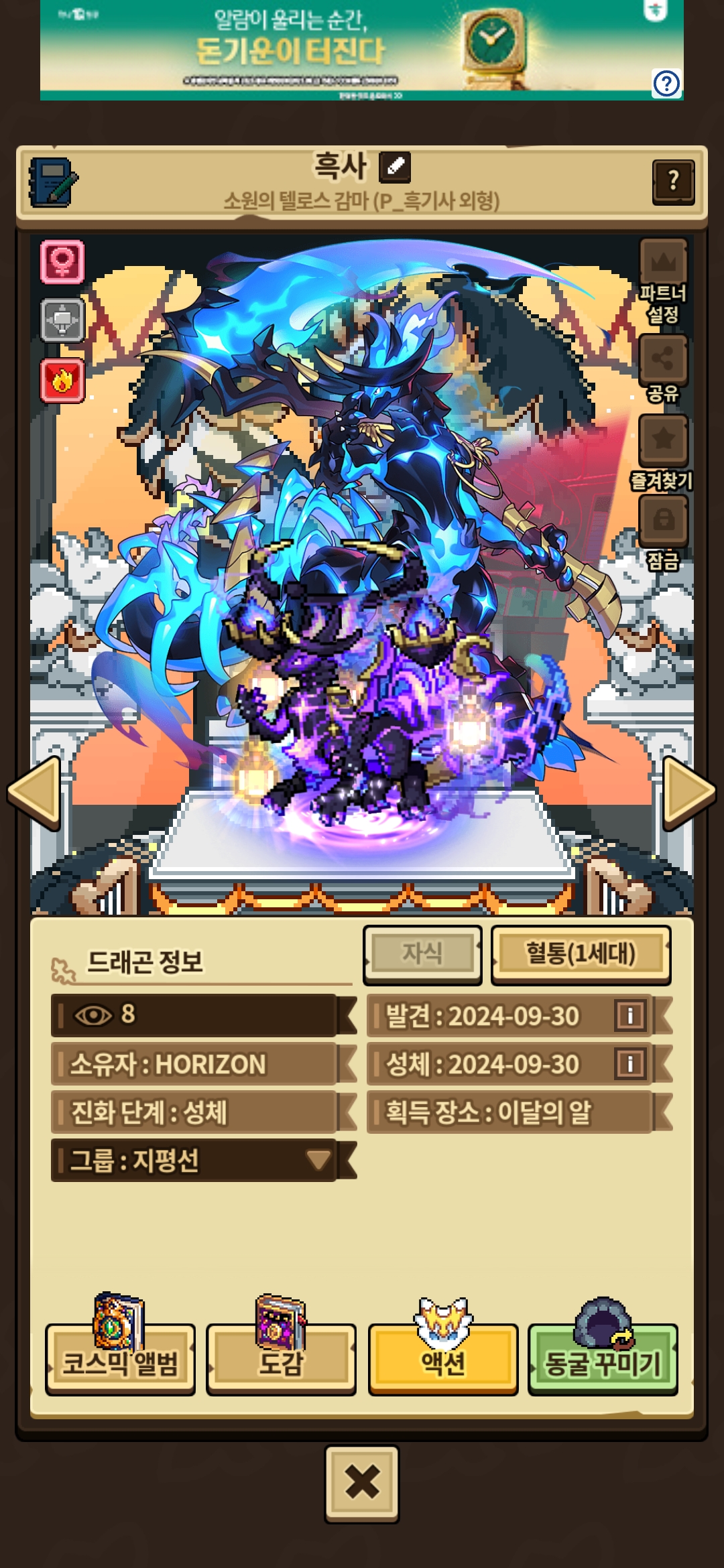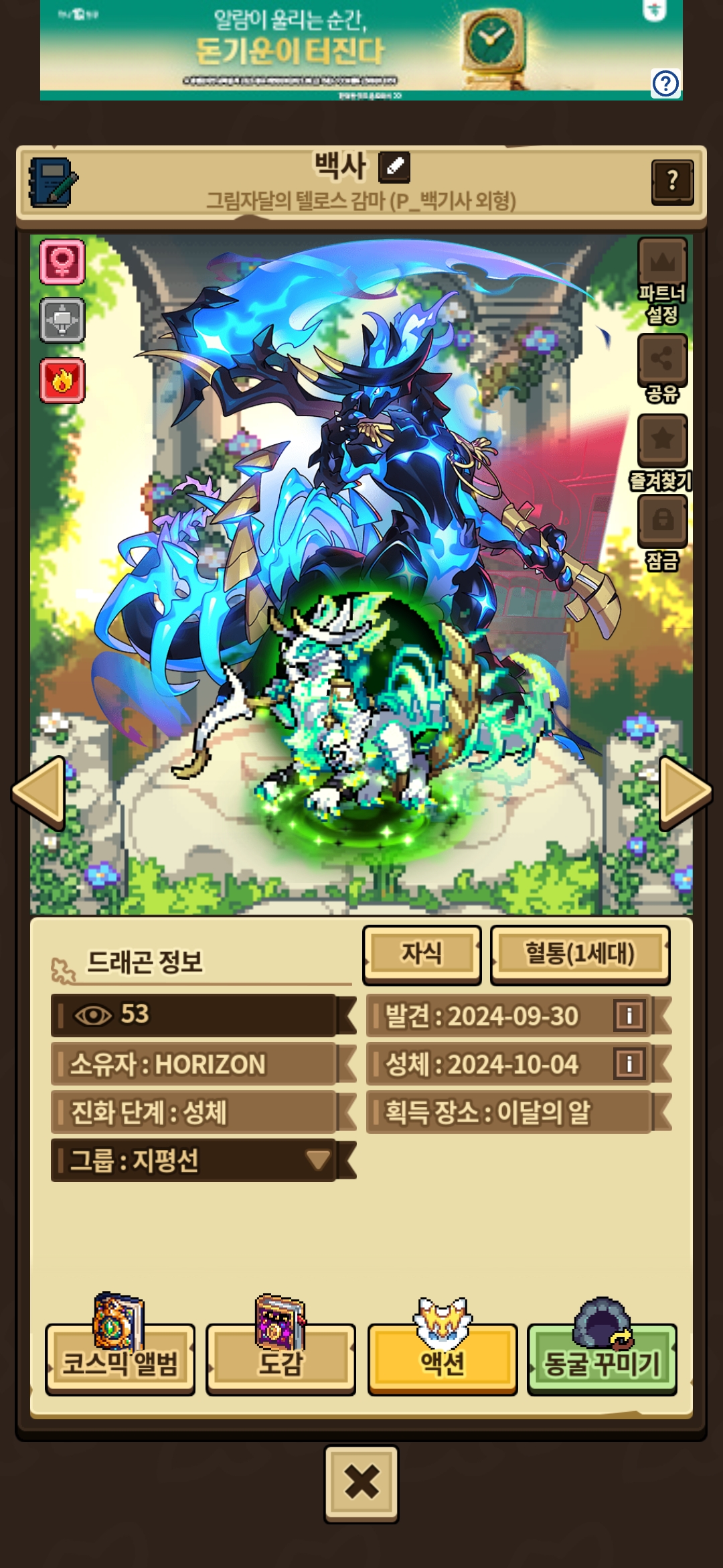 아직 텔로스감마 적, 청기사 암컷이랑 바데무스 빛의관망자 암컷은 안 키웠는데 빨리 키워주고 싶네요ㅋㅋ 바데무스 빛관망자 말고는 취향 아니었는데 2트만에 암수 다 떠줘서 정말 감사했던..🥳