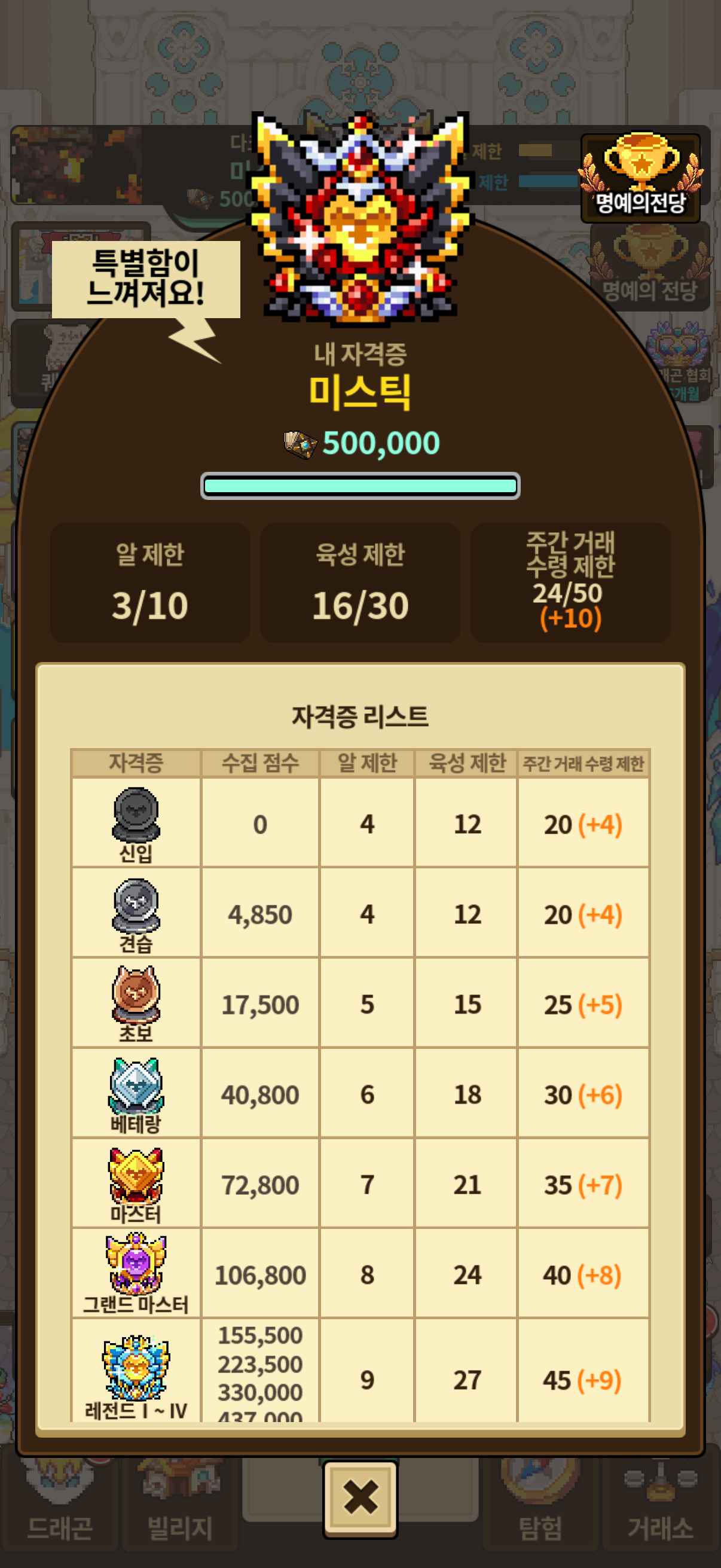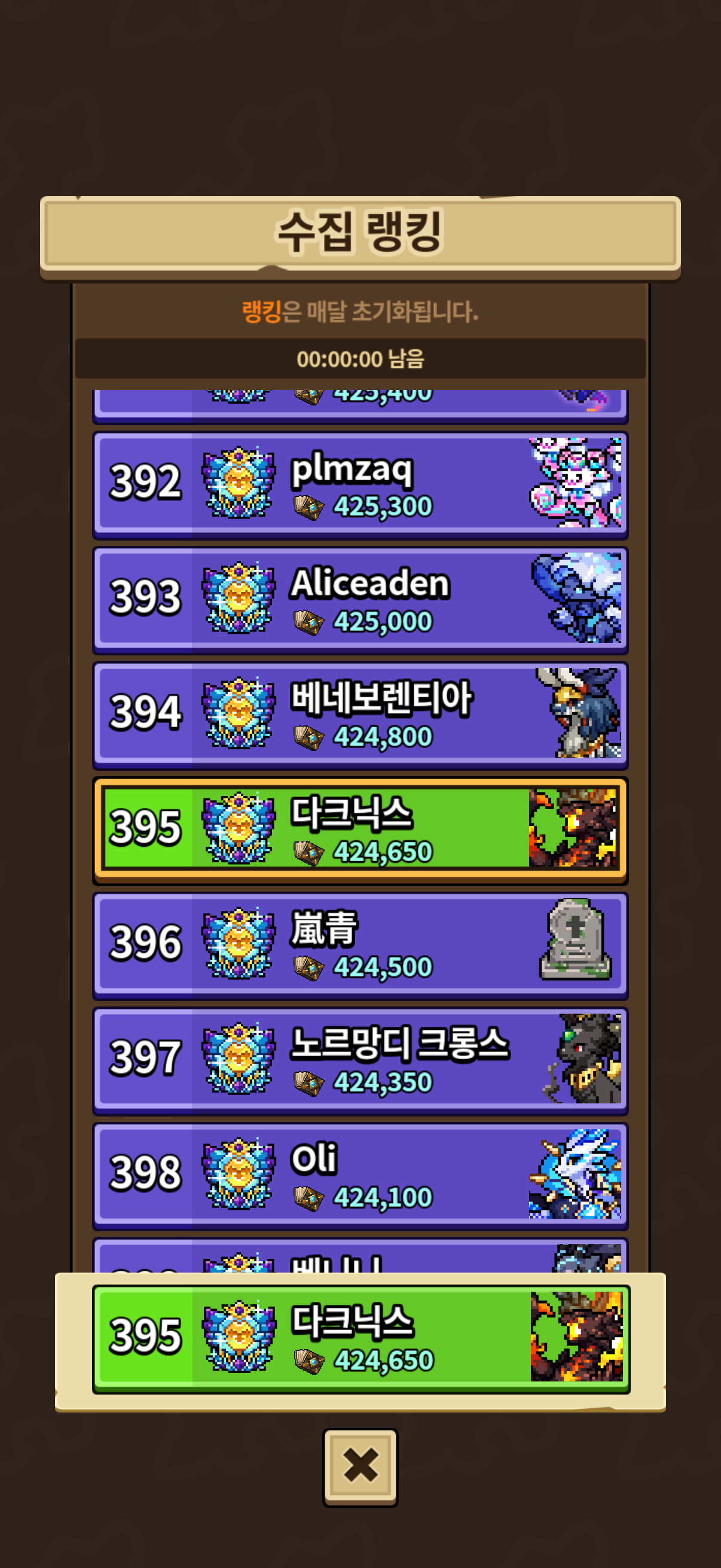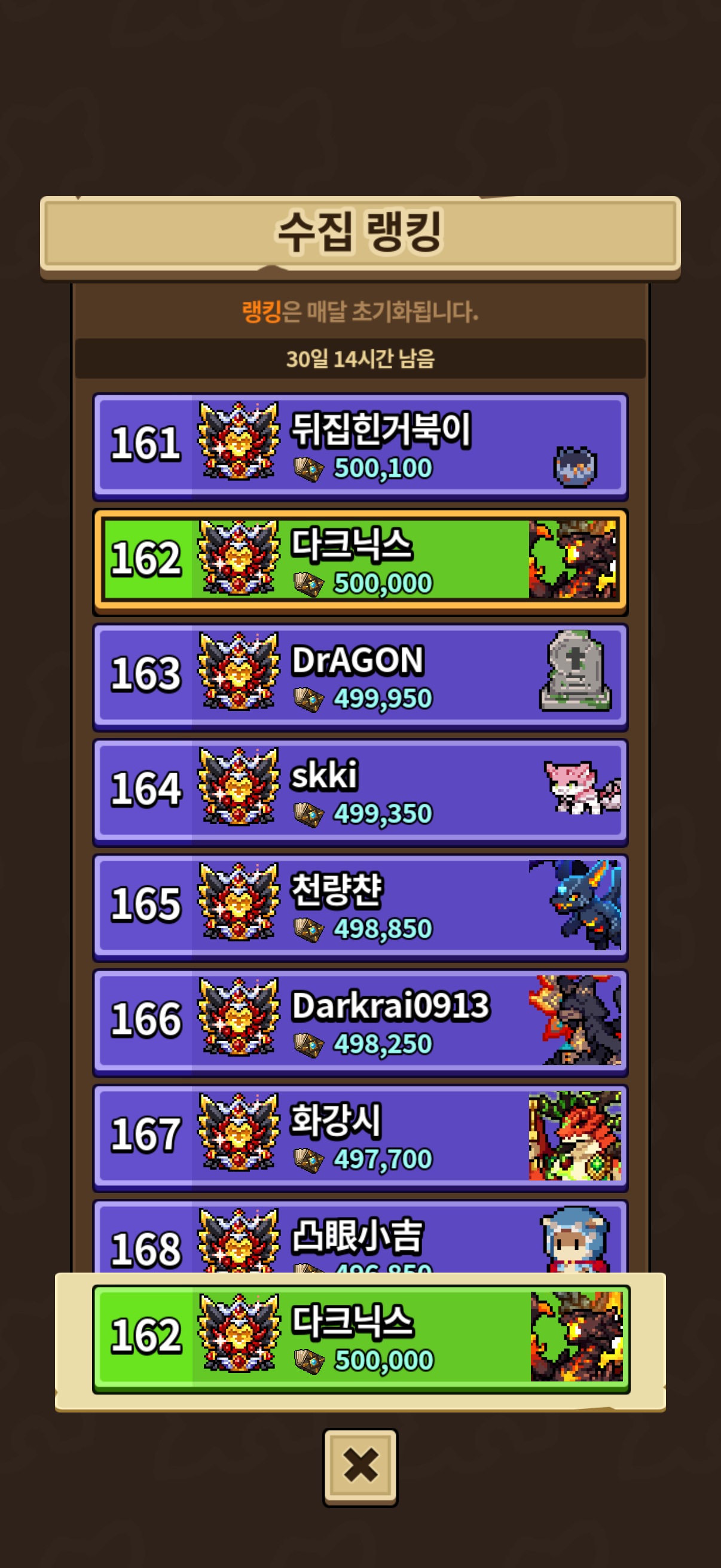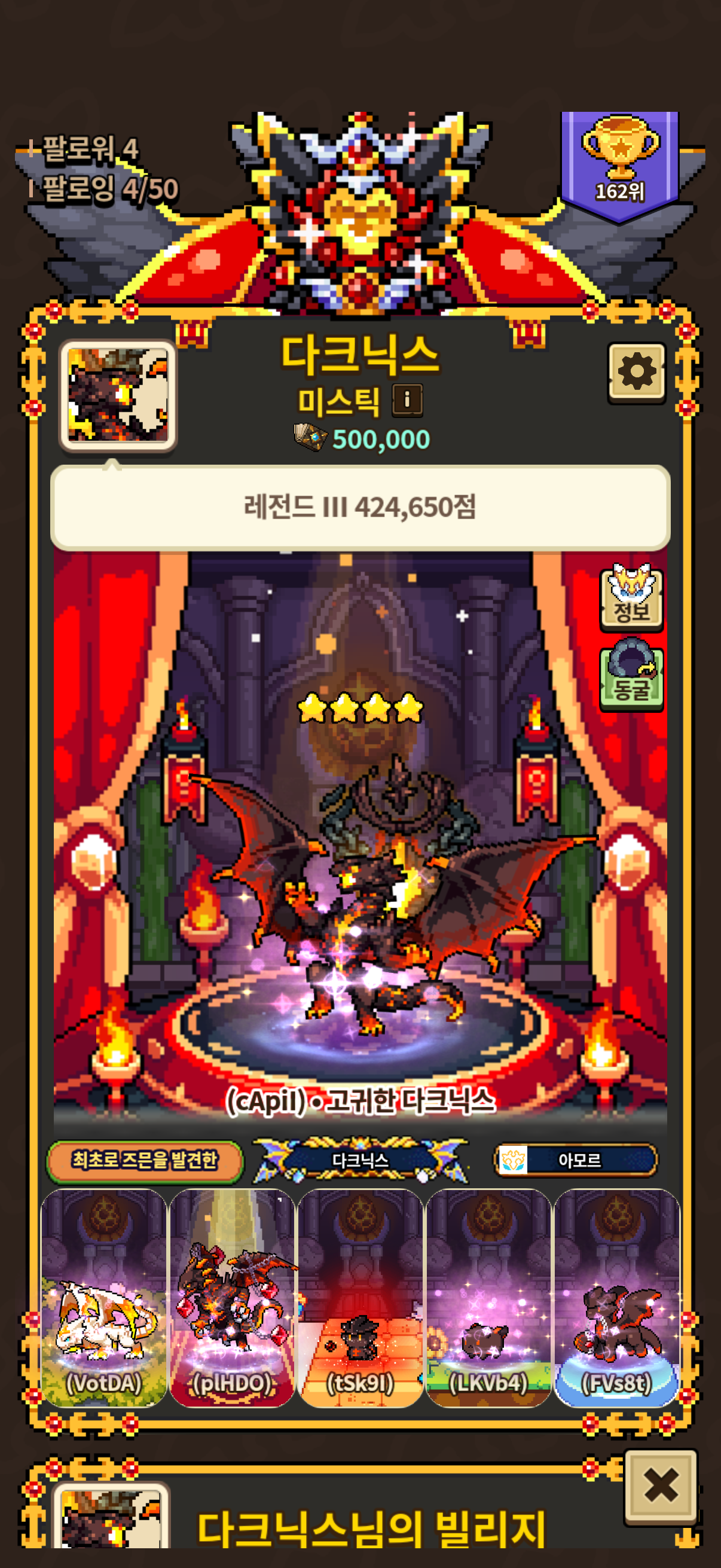 424,650점 레전드 III에서 한 달동안 500,000만점을 목표로 +75,350점을 올려서 365위에서 500,000만점으로 162위 미스틱 등급으로 승급했어요!