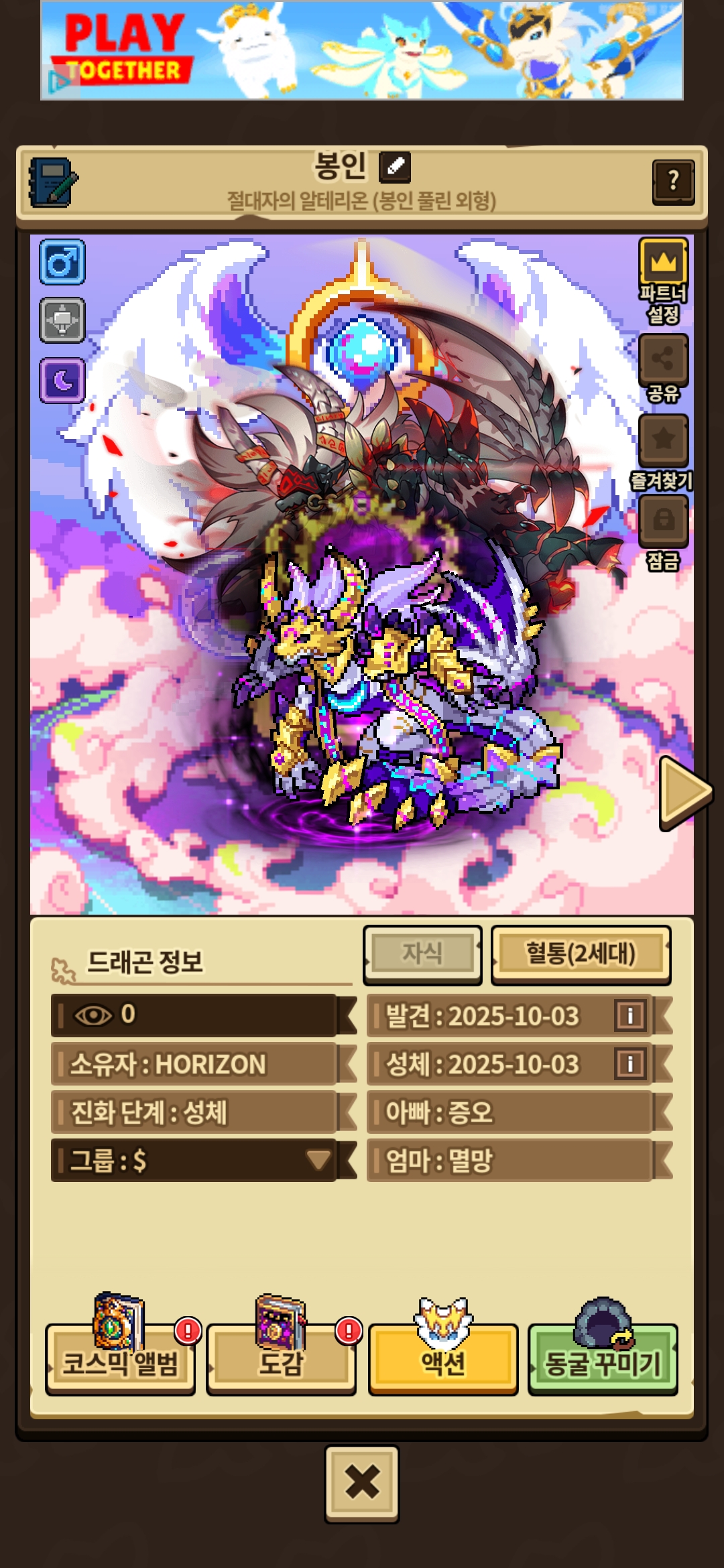 모니모 때 800? 1200?다이아 현질하고도 버그 외형 한마리도 안나왔었는데 이번에는 멸망의달조각 얻으려고 400다이아만 결제했는데도 봉인풀린외형이 떠줬네요.. 너무 감격스러워서 하나밖에 없던 절대자의 달조각도 붙여줬어요🥹