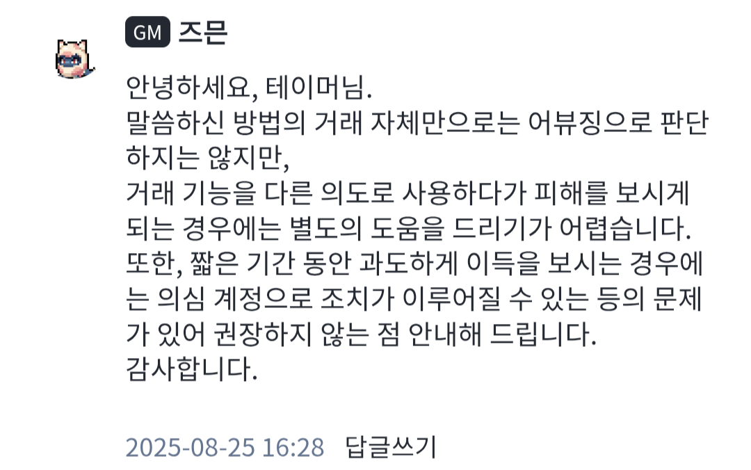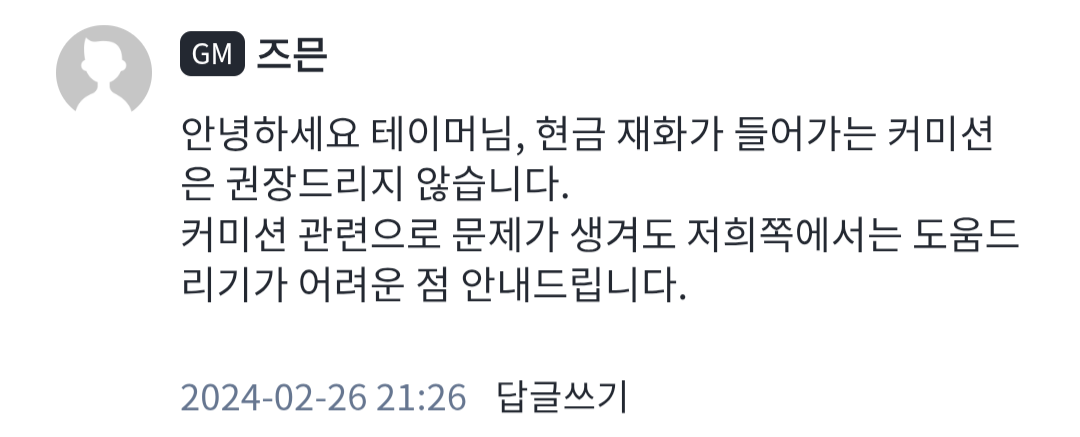 현금거래는 제재대상이라고 못 박았는데 커미션 계열은 권장하진 않는다¹고는 하나 어뷰징으로 보진 않는다²고까지 했음
