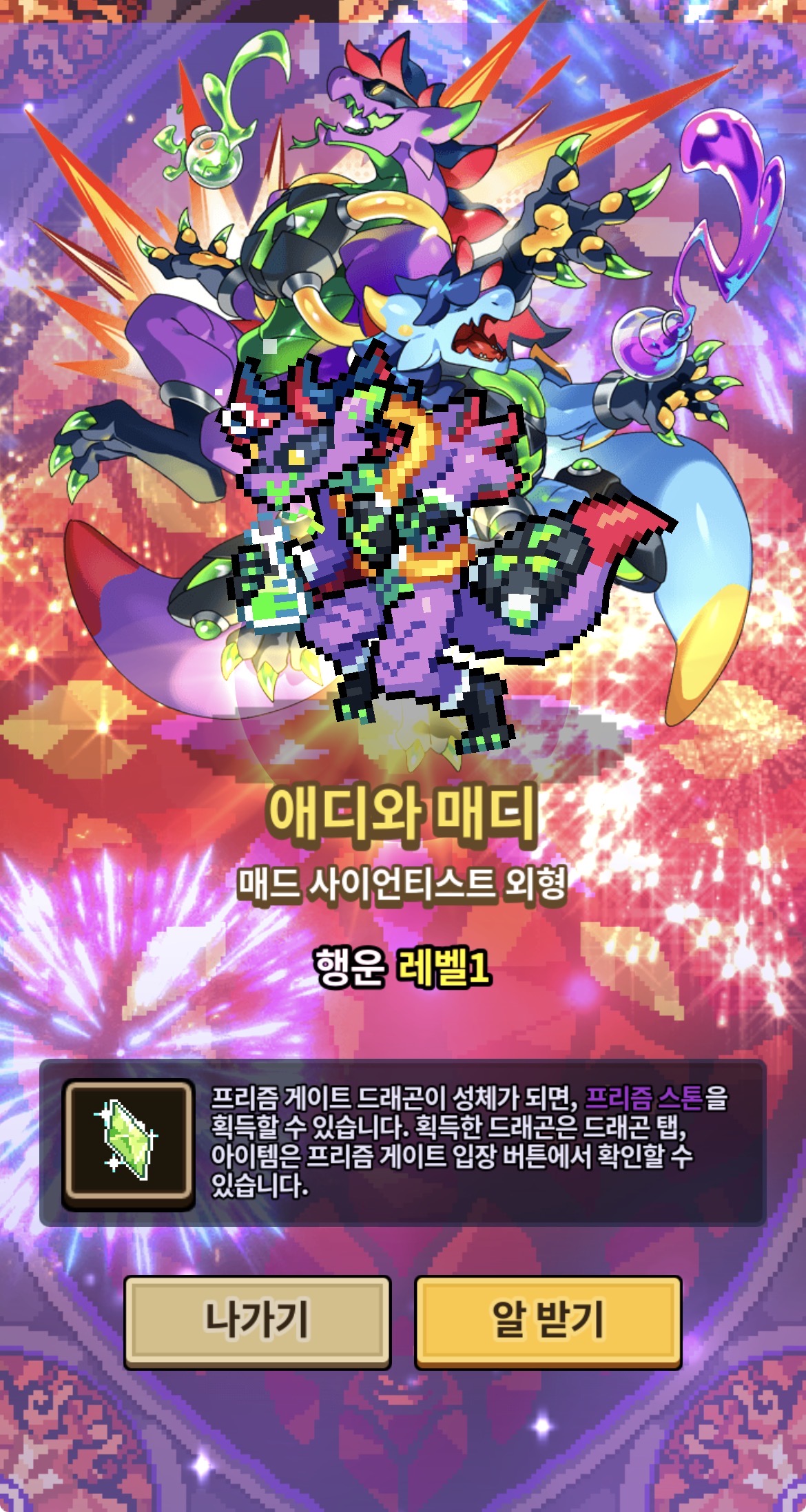 프리즘에서 5~6 단계까지 겨우 가도 데빌곤, 순둥곤만 나와 열받아서 실패할 작정으로 확률 낮은 것으로 다 고르고 1레벨로 마무리했는데, 짠 하고 애디와 매디가..