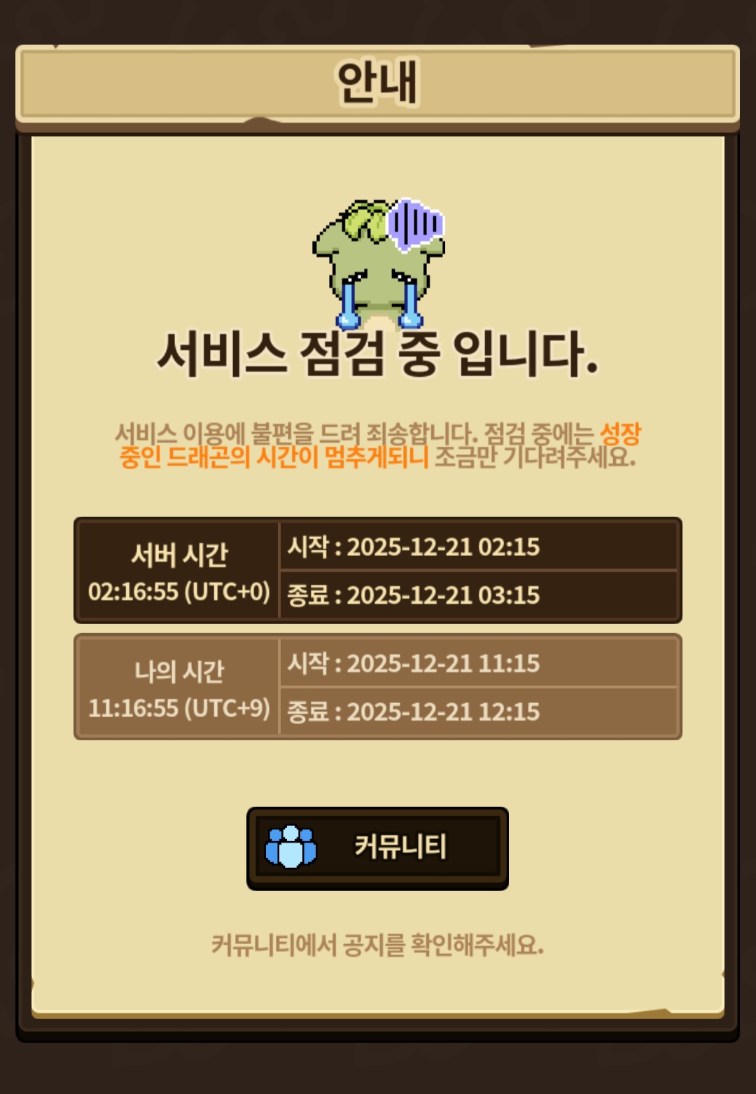자유게시판 서버점검 들어갔네요 키위새 2025-12-20 18:18 181 1 공유 공유 URL 복사 페이스북 왓츠앱 카카오톡 라인 레딧 닫기 공유 0 0 댓글 1 삭제 이미지첨부 0/3000 등록