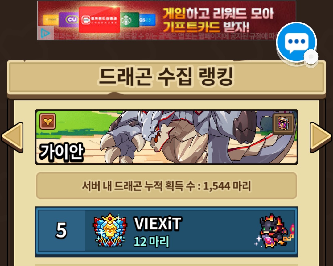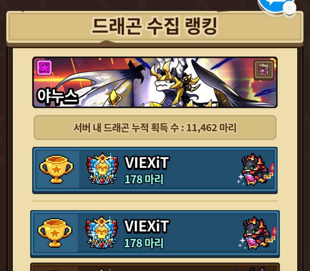 막 300마리 1000마리(… )씩 키우시는 분들에 비해 조촐하긴 하지만 최애룡 수집 랭킹 1위 만족스럽네요