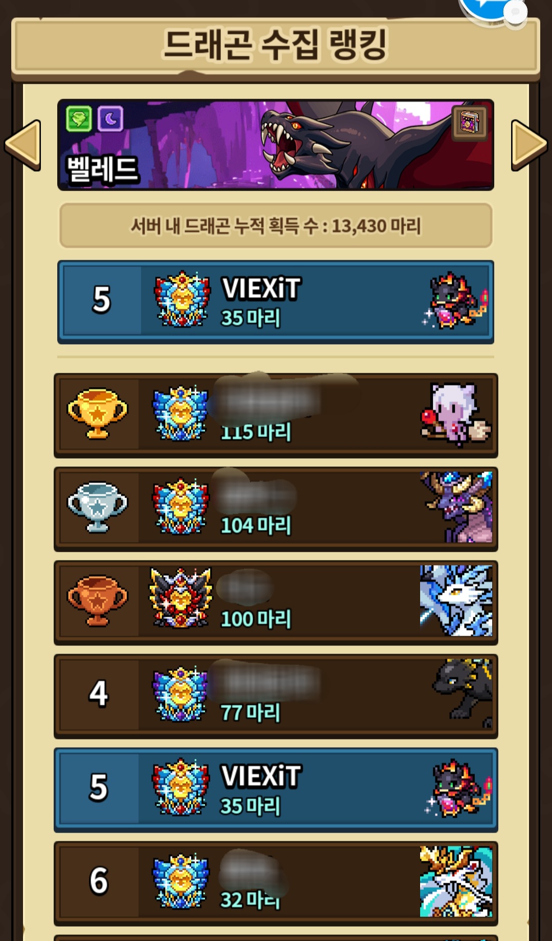 또 다른 최애룡인 벨레드는 5위에 들었네요