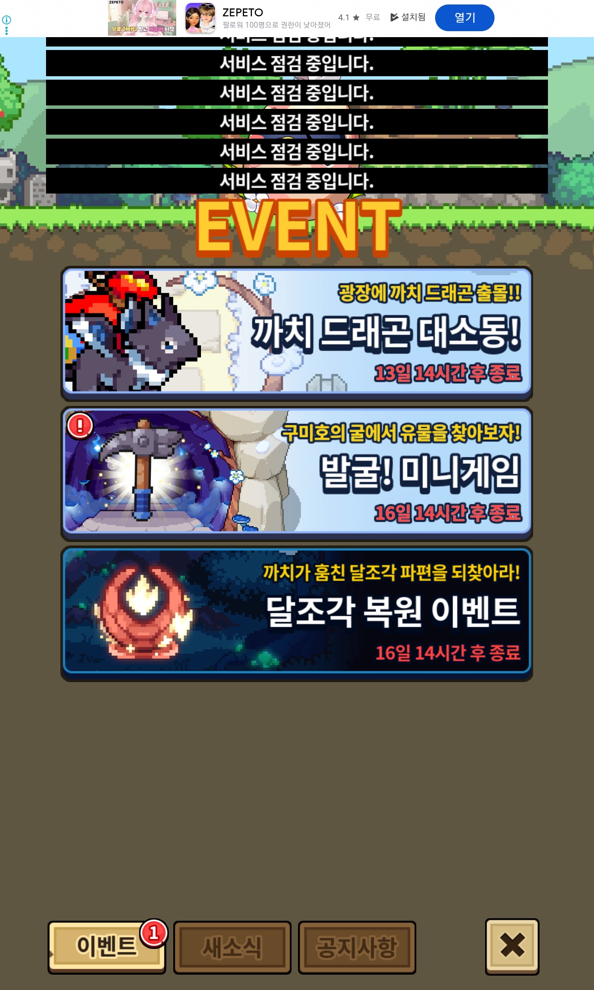 들어가지질 않네요… 구미호를 되게 기대하고 일 마치자마자 들어왔는데 서버 렉+ 서비스정검이라고 미니게임을 아예 못들어가네요… 제대로 테스트 진행하지도 않고 낸건 무슨 의미죠?ㅋㅋ