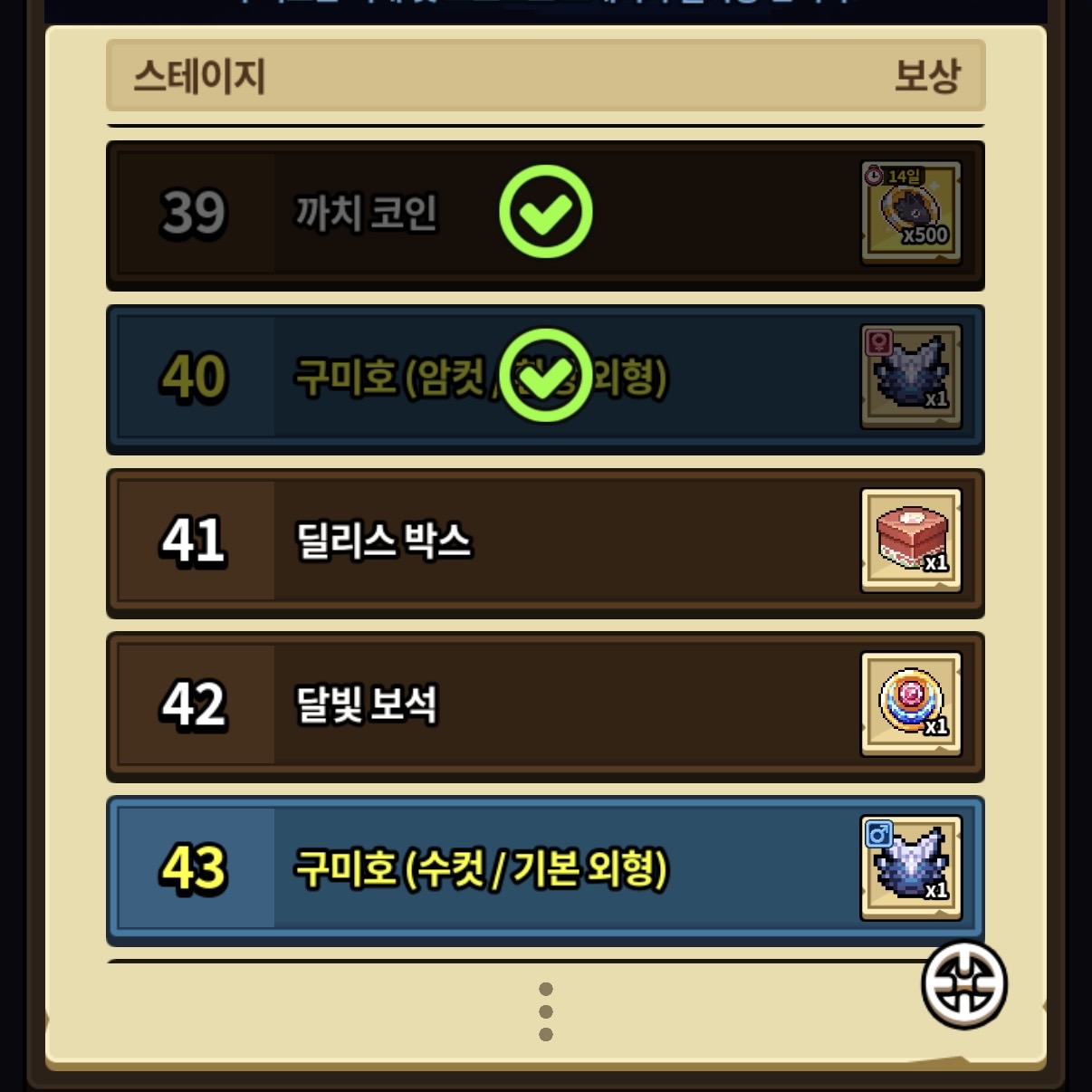 황금 까치도 잡아보고 구미호 일반 외형 두 쌍, 40 스테이지까지 와서 드디어 특수 외형 한 쌍까지 다 얻었네요! 이젠 천천히 재?밌게 이벤트 해야겠어요 ㅋ,,