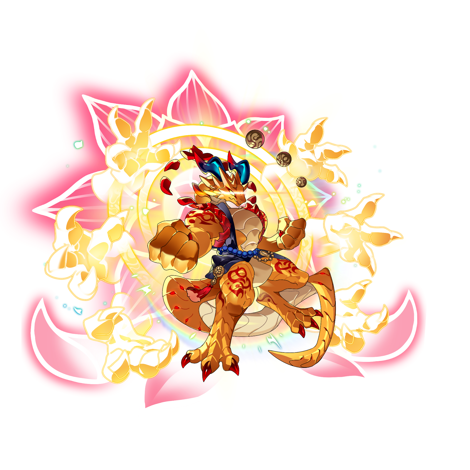 황금빛 몸과 부유하는 구슬, 뒤로 펼쳐진 다수의 빛의 잔영으로 신성한 위용을 드러낸다.