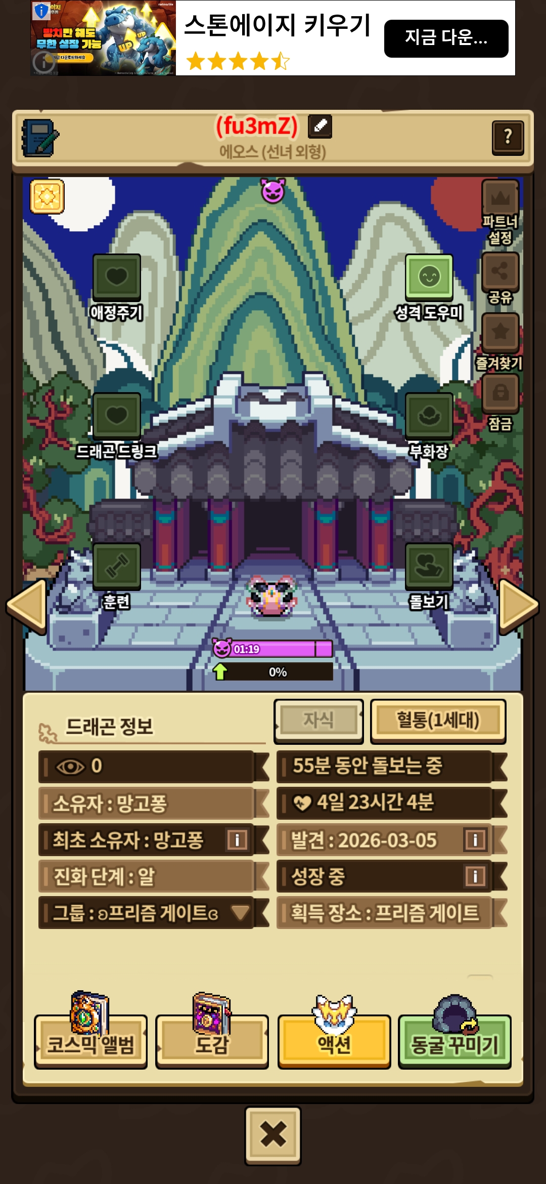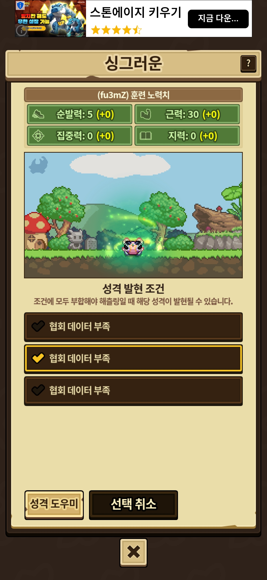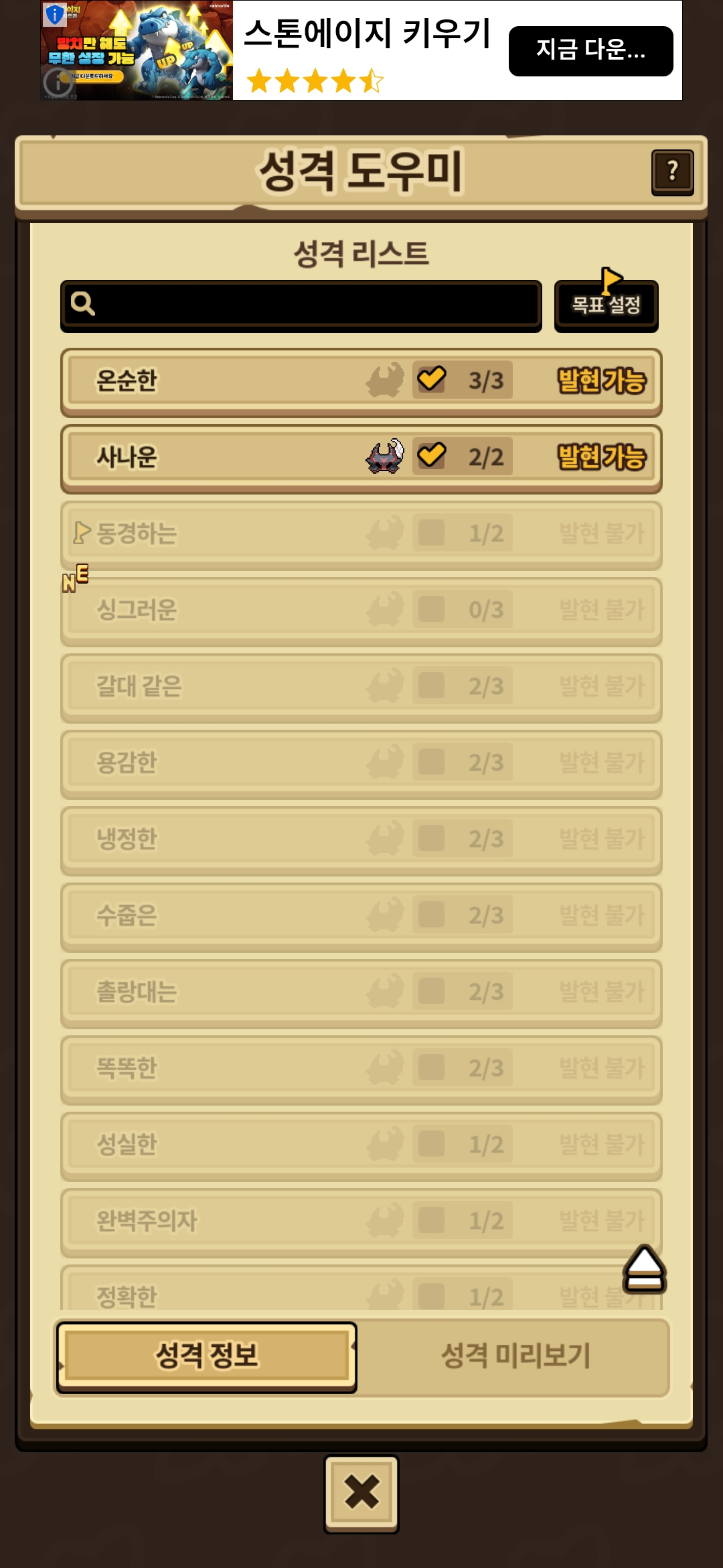 사납작중이던 아이는 조건해제 되어있고, 돌보기 0회였던 아이는 조건달성이었습니다.