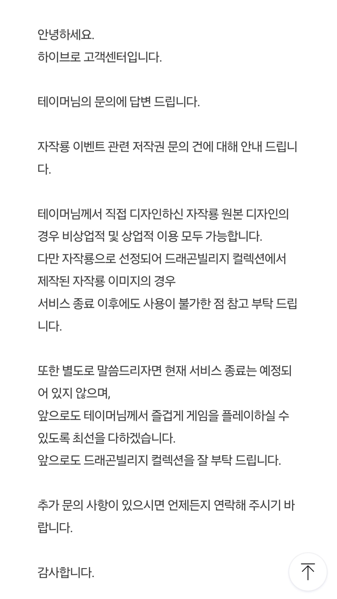 자작룡 공모전에 참여하면서 저작권 관련해서 좀 궁금한게 있어서 직접 여쭤봤더니 공식으로부터 이렇게 답변 받았습니다.