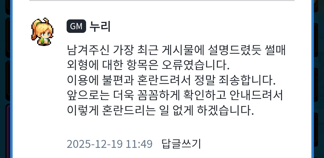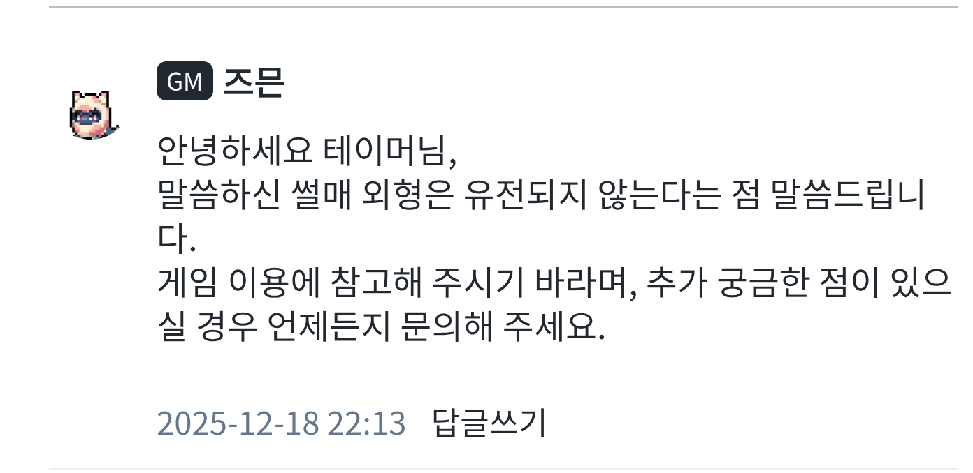 뒷북 죄송합니다만 솔직히 욕 먹을 거 각오하고 올립니다. 전년도 크리스마스 사건 때입니다, 썰매 외형 유전에 대해 같은 길원분이 받으셨던 답변이 1이고요. 후에 다른 분이 받으신 답변이 2입니다. 애초에 버그였으면 그분이 처음 물어보셨을 때도 버그라고 하셨겠죠. 그래놓고 이미 교배해놓으신 분들이 커뮤니티에 뭐라 하시니 그제야 바꾸셨죠, 1일 방치해놓고 후에요. 그때 당시 카드팩 문제로도 이미 커뮤니티가 타오르느라 안 올렸었다만, 아무리 바쁘셨다 한들 회사 내 소통이 잘 안 돼도 확률까지 논의 못하실 정도는 아니셨을 거라 생각합니다. 또한 점점 과금 요소를 늘리시면서 재미는 챙기지 않으시고, 그나마 몇 달 전에 다들 들고 일어나시니 배상이라도 하셨으나 이젠 유저분들이 뭐라 하셔도 듣지도 않으시네요. 유저들과 소통을 해야 어떤 점을 고칠지, 무엇을 추가할지 아시지 않겠습니까? 가치 보존하신다 하지 않으셨습니까? 저희 유저들은 맨날 기싸움해야하는 돈벌이 수단에 불가한가요? 맨날 버그 탓, 유저 탓으로 돌리면 다인가요, 이렇게 증거가 남는데?