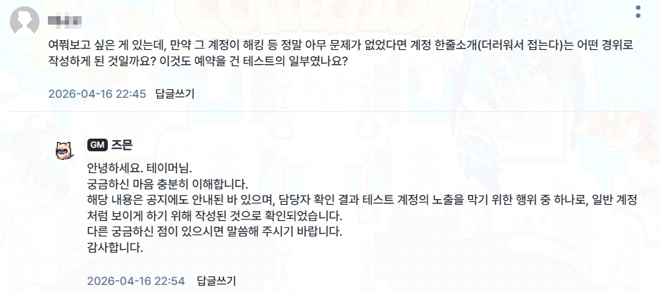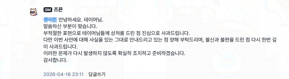 이게 과연 '미숙한 대응'으로 끝날 일인가요? 이건 운영진이 유저들의 소통 방식을 ‘더럽고 천박한 것’으로 규정하고 흉내 낸, 아주 질 나쁜 기만입니다.