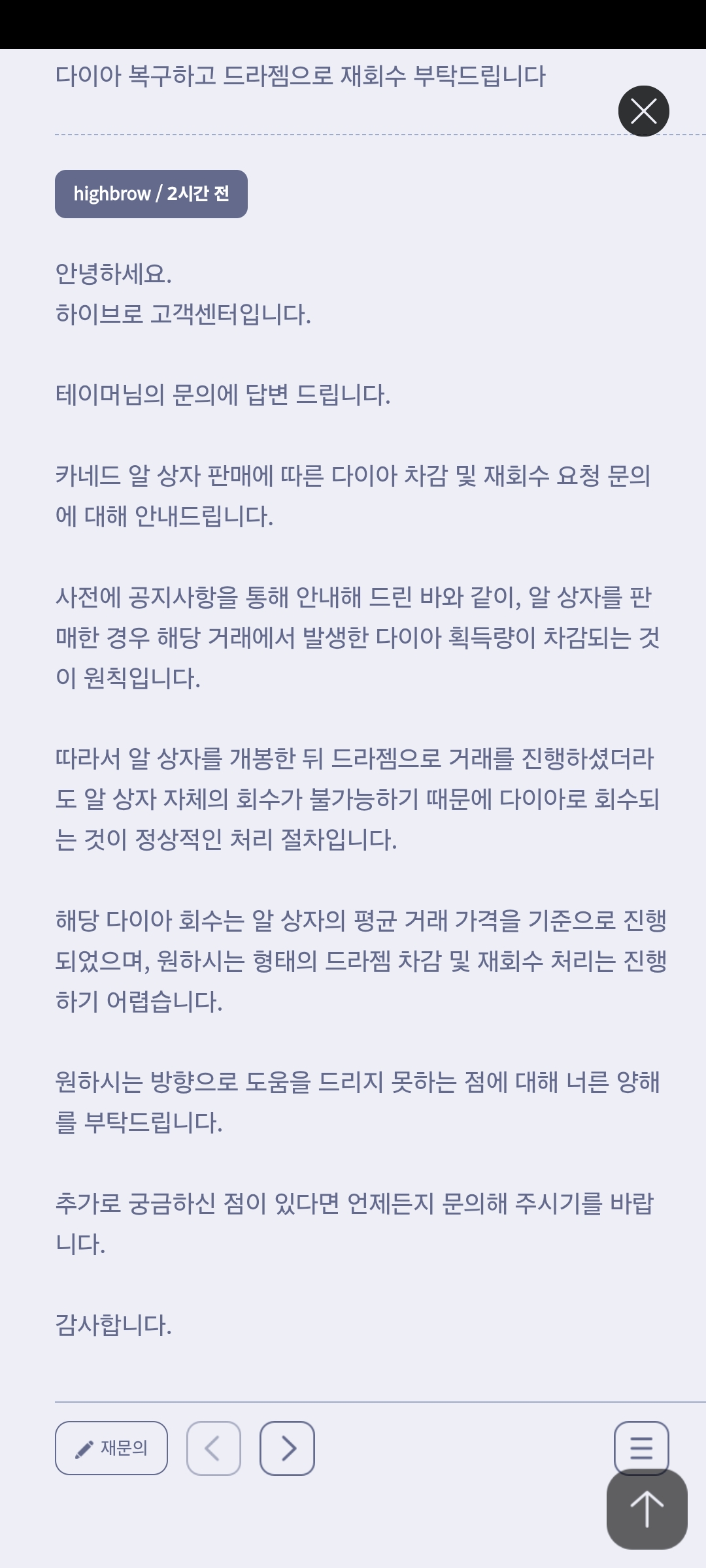 알상자를 까서 팔았으면 회수 못하니 드라젬으로 팔았어도 다이아로 차감해야하는게 원칙이다