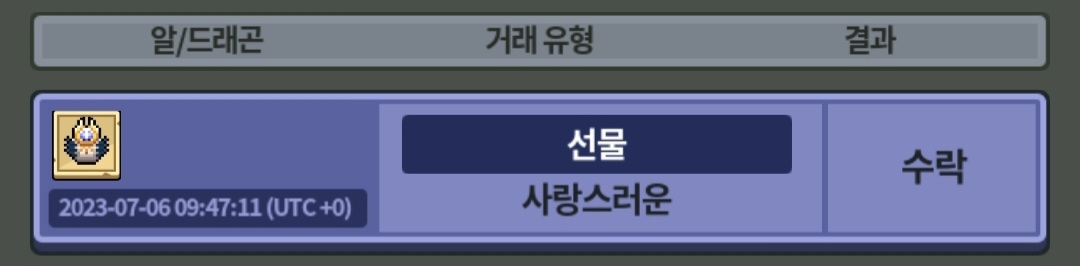 애주 뜬 아이 없나 무심코 들어왔다가, 거래소에 웬 빨간 1이 떠있길래 오잉? 하면서 가봤습니다. 거래 올려둔게 없었는데.. 라고 생각하면서요. 그런데 요청 리스트에 1이 떠있더랍니다. 누가 갠거를 걸었나.. 그때까지도 갸우뚱하고 있었어요. 정말… 꿈에도 몰랐다구요……. 발신자는 사랑스러운님이었습니다..!!!! 얼어붙어있다가 커뮤니티 들어와보고 당첨 소식 접하고 나서 떨리는 손으로 수락을 눌렀습니다.. 그러자 섬광이 번쩍하며…
