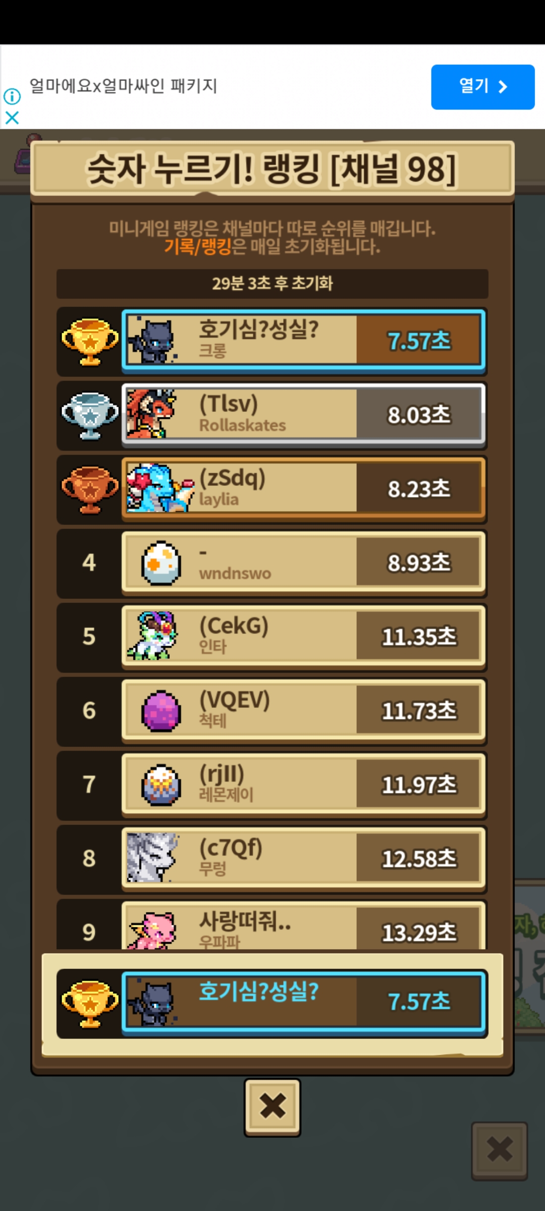 숫자 누르기를 98채널에서 진행하셔서 제 기록보다 빠르거나 제 기록에 가장 가까운 기록을 남기신 분께 고신 순혈 2세대를 드립니다!