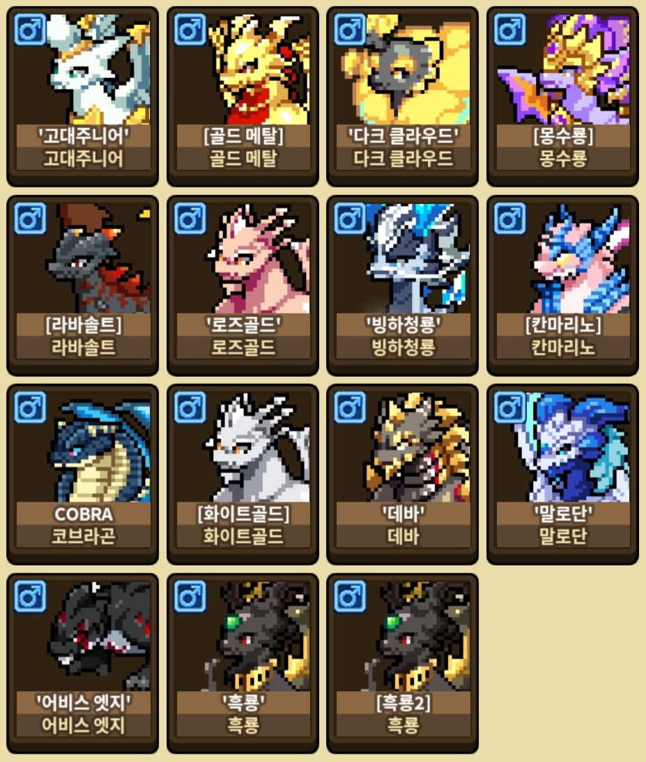 (교배용은 모두 2세대 / 퀘스트용,업적보상용은 1세대 참여)