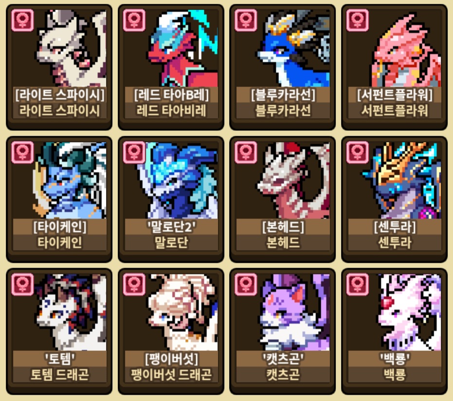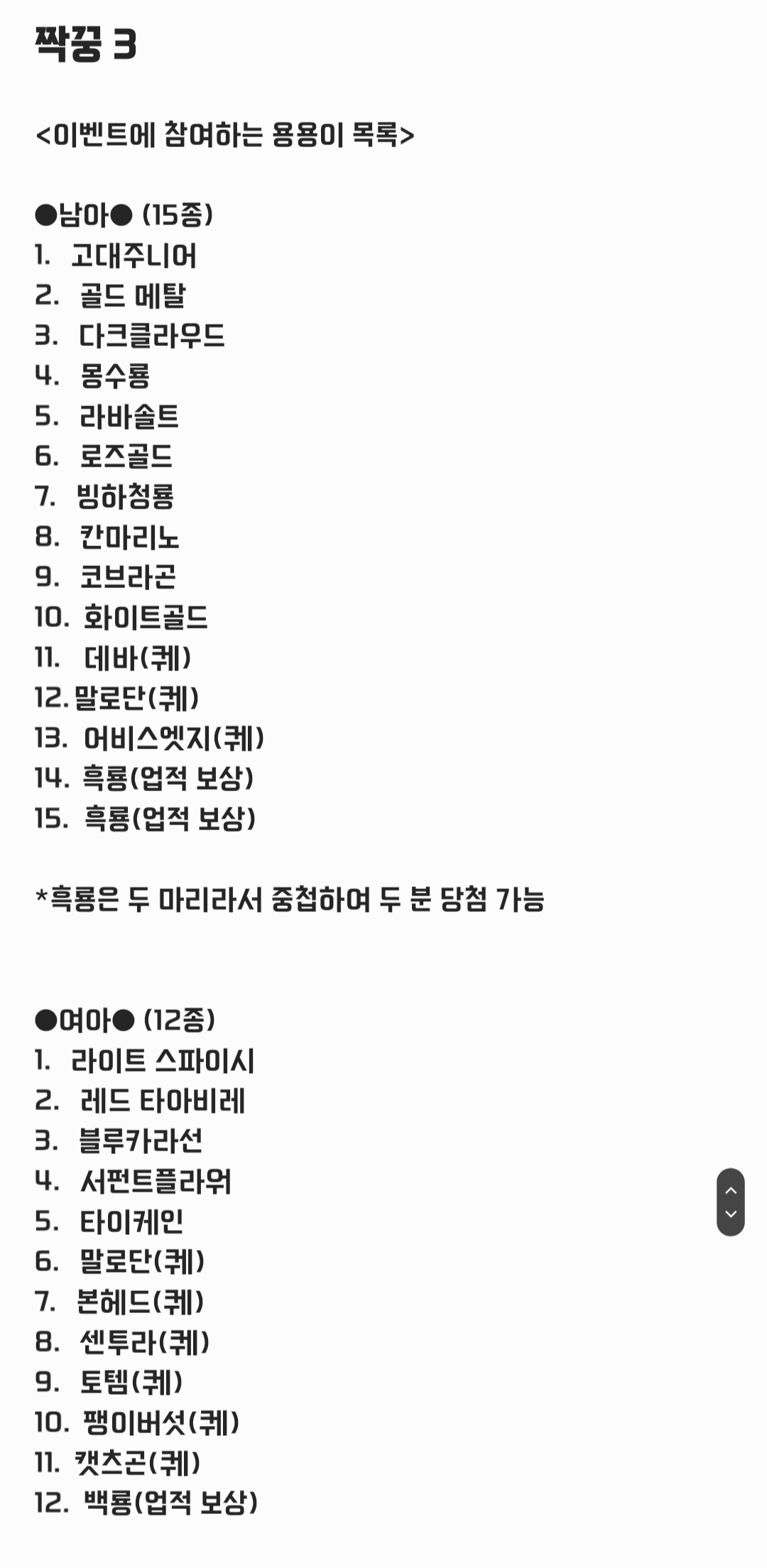 (참고2 : 혹시나 당첨되어 이후 선택한 두 용을 교배시 교배불가가 뜬다면 최종 낙첨입니다, 교배연구소 게시판 정보에 없는 교배식이라면 공유하겠습니다, 이 때 낙첨자도 추첨 당시 당첨자로 포함되어 있기 때문에 이후 따로 추가 당첨자를 추첨하진 않습니다!)