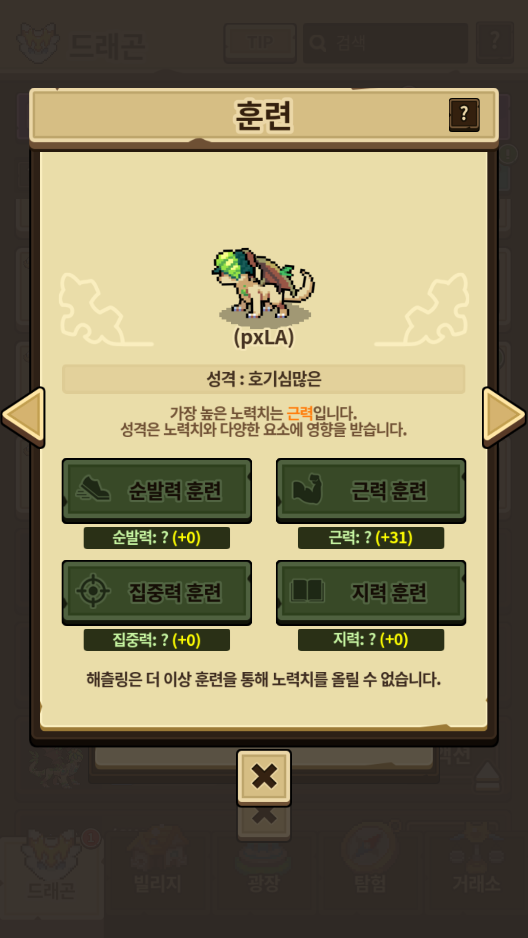 그래서 행복도를 낮춰서 성장 속도를 늦춘 다음, 이틀 치 상자(20개)를 이 스왐프 드래곤을 파트너로 설정하고 열었습니다.