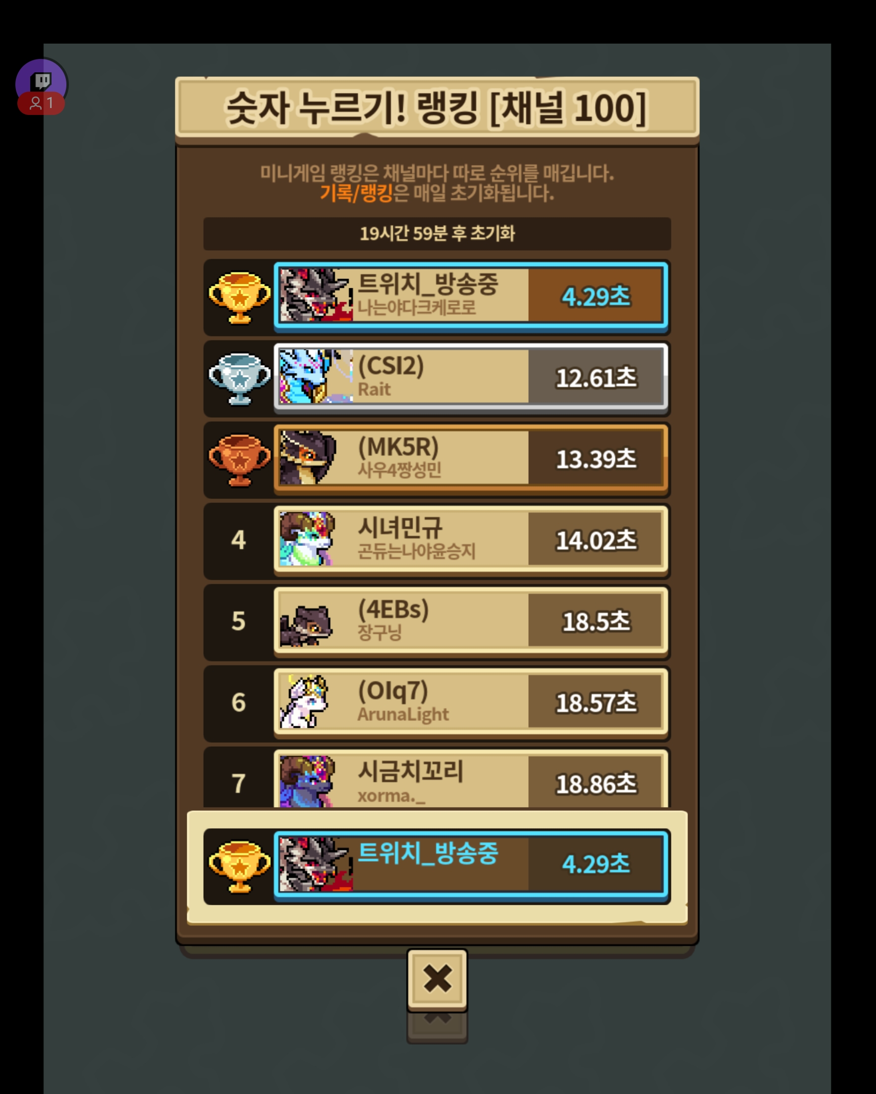 1~100채널 숫자 누르기 랭킹 침략 완료했습니다.