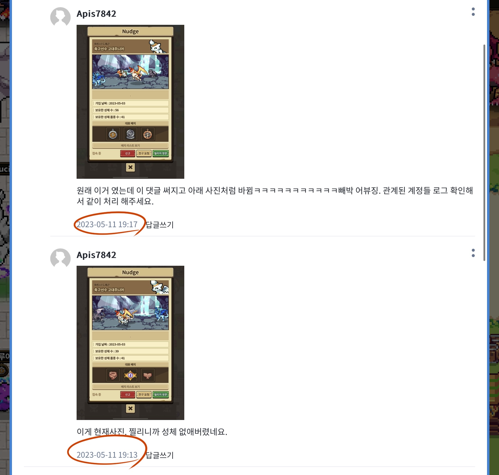 2023년 5월 11일 19:04분경 처음 Nudge 어뷰징 신고됨.