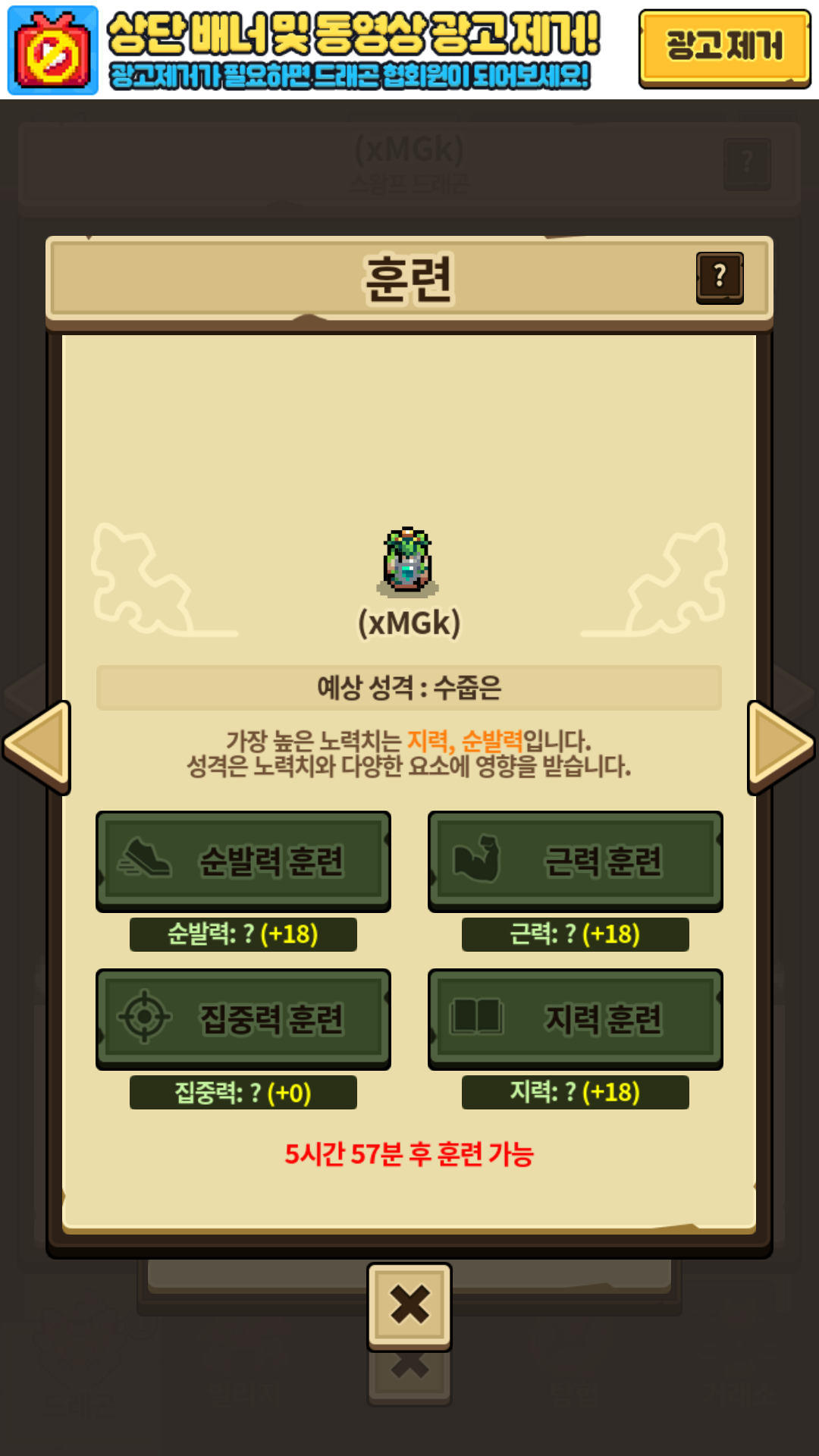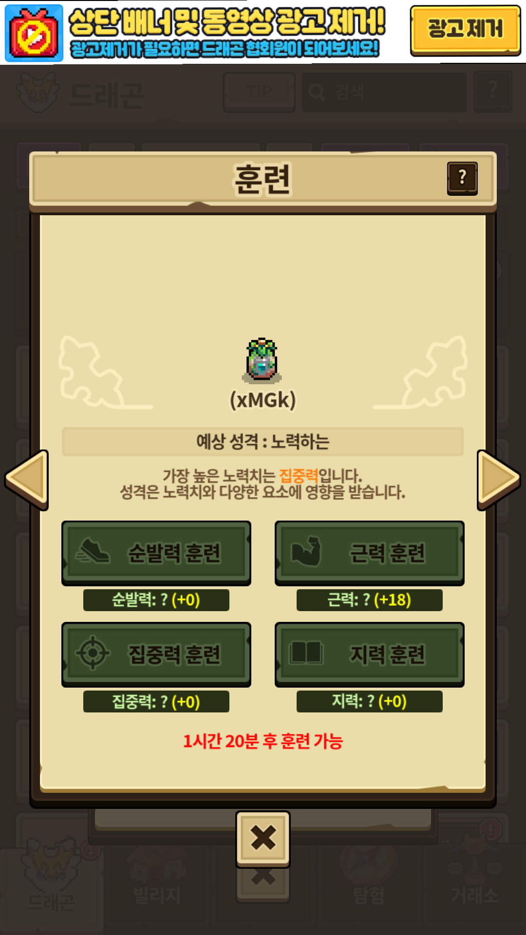 지력을 2번 훈련(+18)하고 나서야, 지력이 집중력보다 높게 되었습니다.