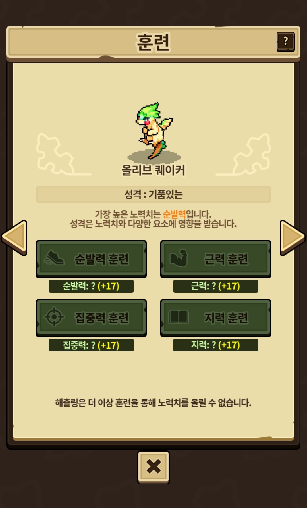 돌보기,훈련 전부 한번씩 하기 O