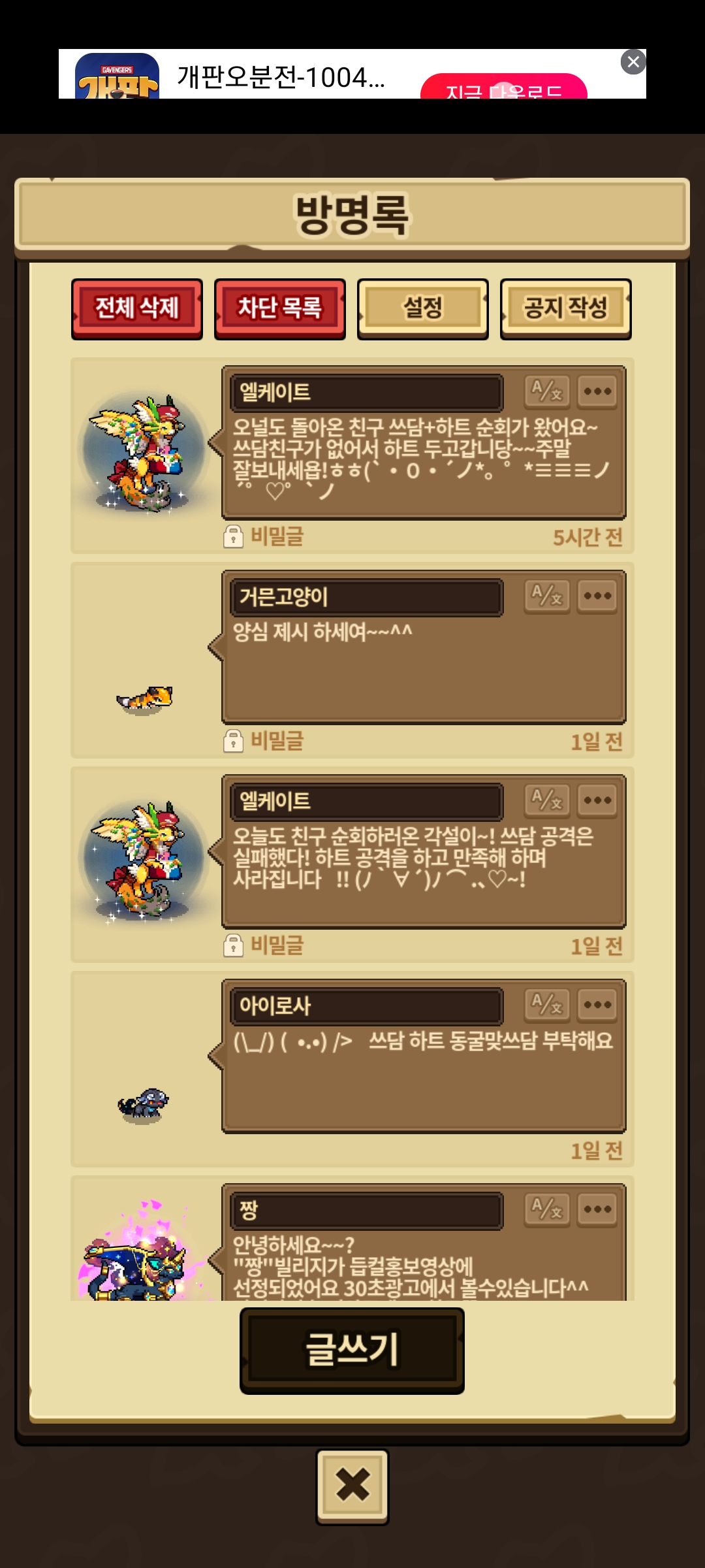 저는 뉴비라서 기부라 쓰신거에 되도록 편하시라고 열심히 키우던 해츨링으로 골라서 제시한건데… 그래놓고 빌리지에 이렇게 적으시고 가서 기부라서 그런건데 왜그러시냐고 물어보니 기부라고 쓴 적 없다하시다 갑자기 제가 빌리지에 써드렸던 비밀 글들이 지워지고는 빌리지에 글도 못쓰게 하셨네요. 너무 당혹스러워요..