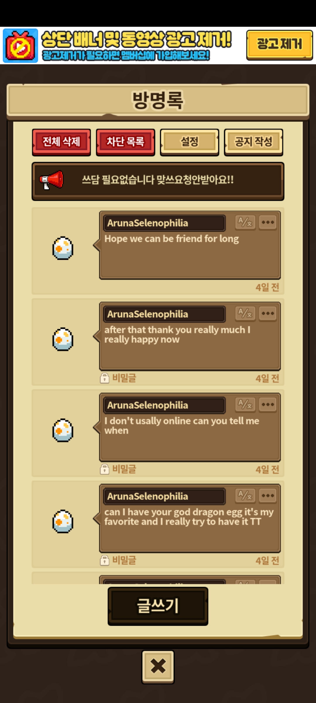 저한테 갑자기 모르는 유저의 방명록이 달려 당황했습니다. 그리고 갑자기 고대신룡(당시 제 파트너 드래곤)의 알을 달라기에 무척 부담스러웠어요; 그럼에도 뉴비기도하고 외국인이 도와달라 하는건가보다, 하고 알을 줬었습니다