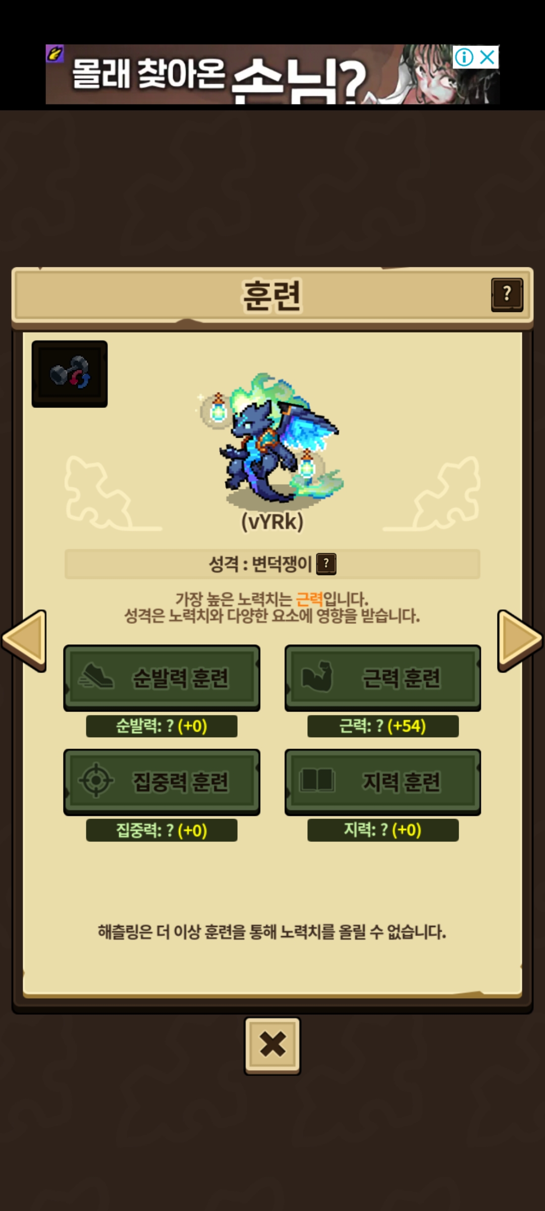 성실한의 조건인 훈련 5번 6x9 54로 훈련 하나만 6번을 했습니다 그리고 루네라까지 사용해서 확인을 했는데 성실한이 나오지 않았습니다 루네라로 확인한건 사진을 찍지 못했는데 지금 쿨이라 다시 찍을수가 없어서 못가져왔습니다;;